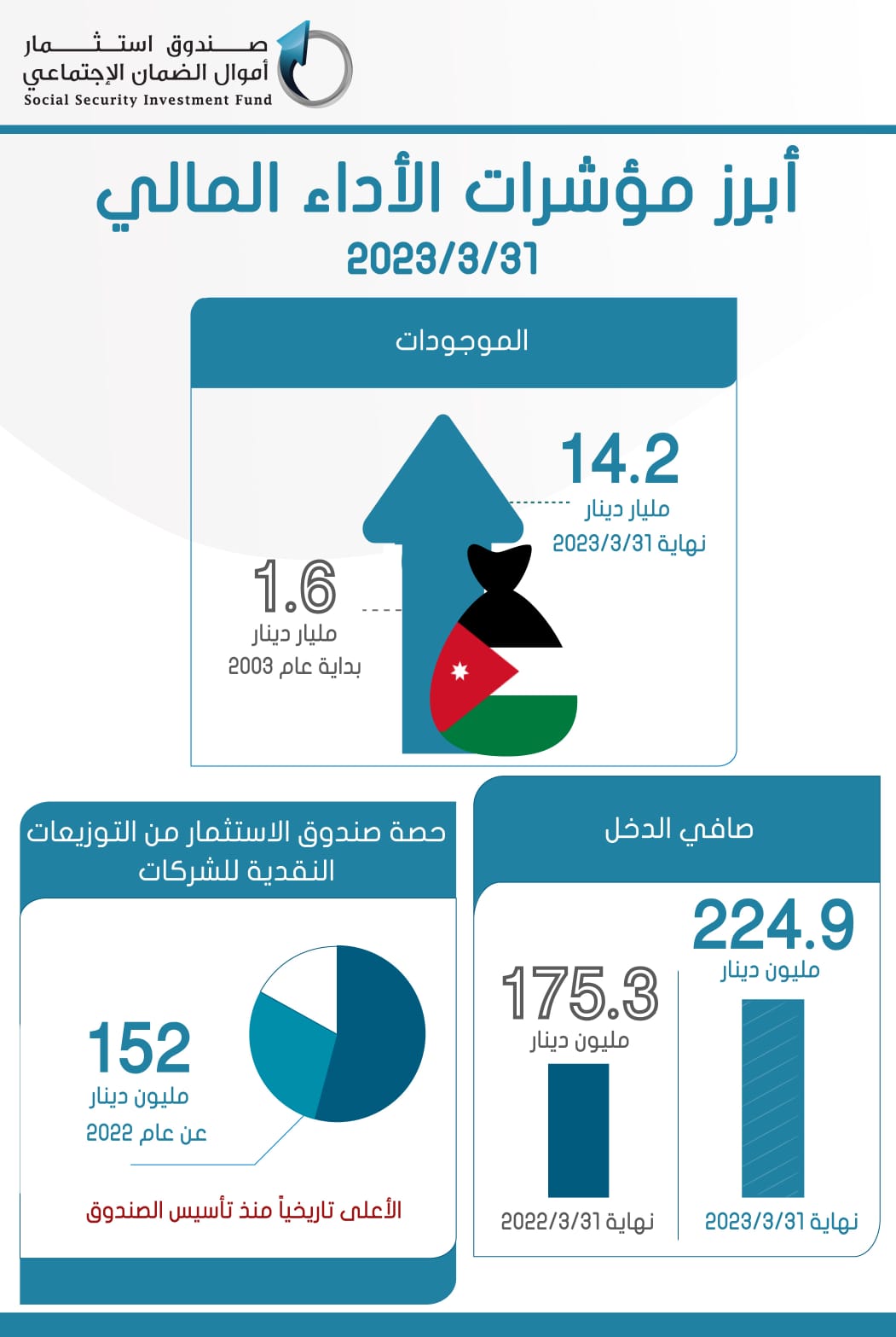 عمون - ارتفعت موجودات صندوق استثمار اموال الضمان الاجتماعي لتصل الى حوالي 14.2 مليار دينار نهاية الربع الأول من عام 2023، مقارنة مع 13.8 مليار دينار نهاية عام 2022.