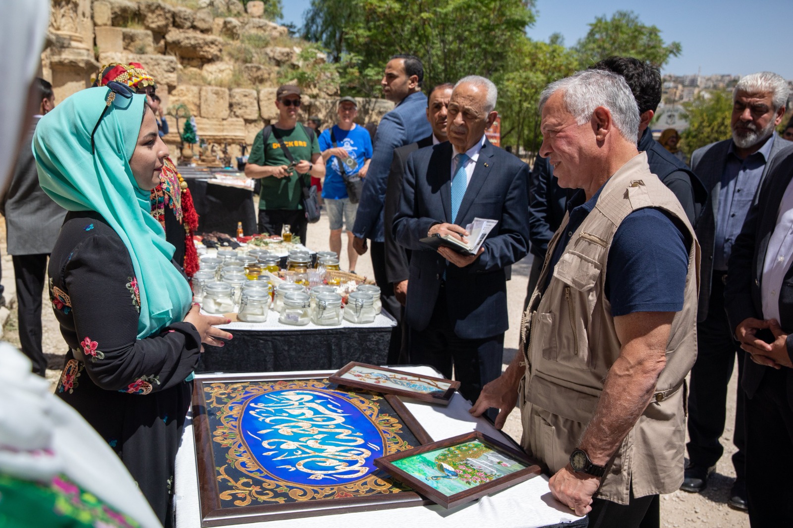 واطلع جلالة الملك وسمو ولي العهد على بازار لمنتجات الجمعيات والمجتمع المحلي، ومعرض للقطع الأثرية، مؤكدا جلالته أهمية دعم المنتجات السياحية محلية الصنع داخل المواقع الأثرية.