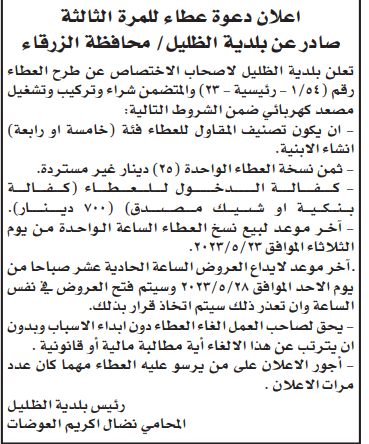 مطلوب شراء وتركيب مصعد كهربائي لبلدية الظليل