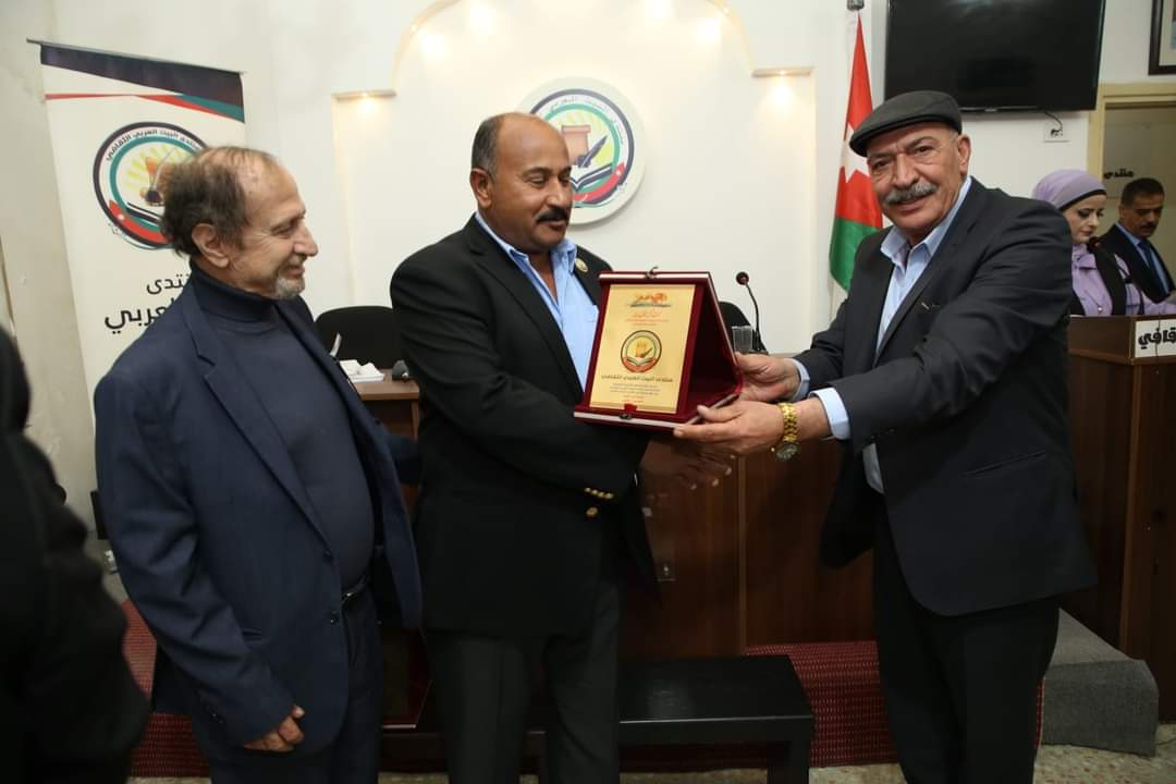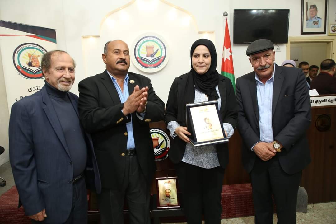 الشاعرة نهى عودة والشاعر علي أبو بكر، ودرع لمنتدى البيت العربي الثقافي لاستضافته الفعالية الأدبية ودرع لمقدمة الحفل الاستاذة غادة عقل.