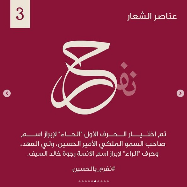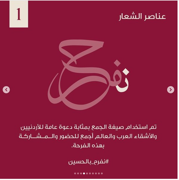 وبحسب فحماوي، فإنّ كلمة "فرح" اختيرت لتكون دلالة لجوهر الحدث وبث روح السعادة والإيجابية، في حين أنّ تصميم حرفي الحاء والراء بشكل ملحوظ ومختلف عن حروف الكلمة، جاء دلالة على الحرفين الذين يبدآن باسمي ولي العهد الأمير الحسين، والآنسة رجوة.