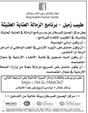وظيفة شاغرة لدى مركز الحسين لسرطان
