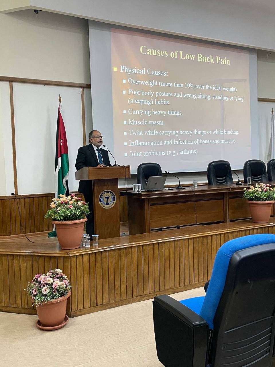 عمون - ضمن خطة كلية العلوم الطبية المساندة / جامعة فيلادلفيا في خدمة المجتمع المحلي، عقد قسم العلاج الطبيعي في الكلية ممثلاً برئيسه الأستاذ الدكتور فؤاد عبدالله محاضرة توعوية بعنوان "اّلام الظهر: الأسباب ، الوقاية والعلاج" وذلك في يوم الاربعاء الموافق 17/5/2023 لأعضاء الهيئة التدريسية والادارية العاملين في الجامعة بالإضافة الى الطلبة من مختلف التخصصات.