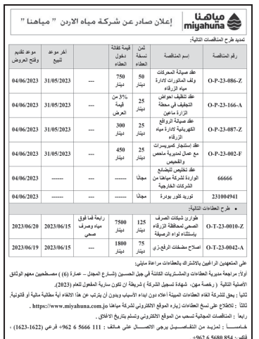 عطاءات صادرة عن شركة مياه الاردن"مياهنا"