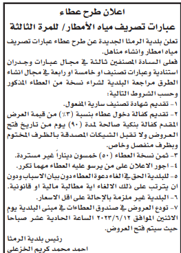مطلوب انشاء عبارات تصريف مياه الامطار لبلدية الرمثا