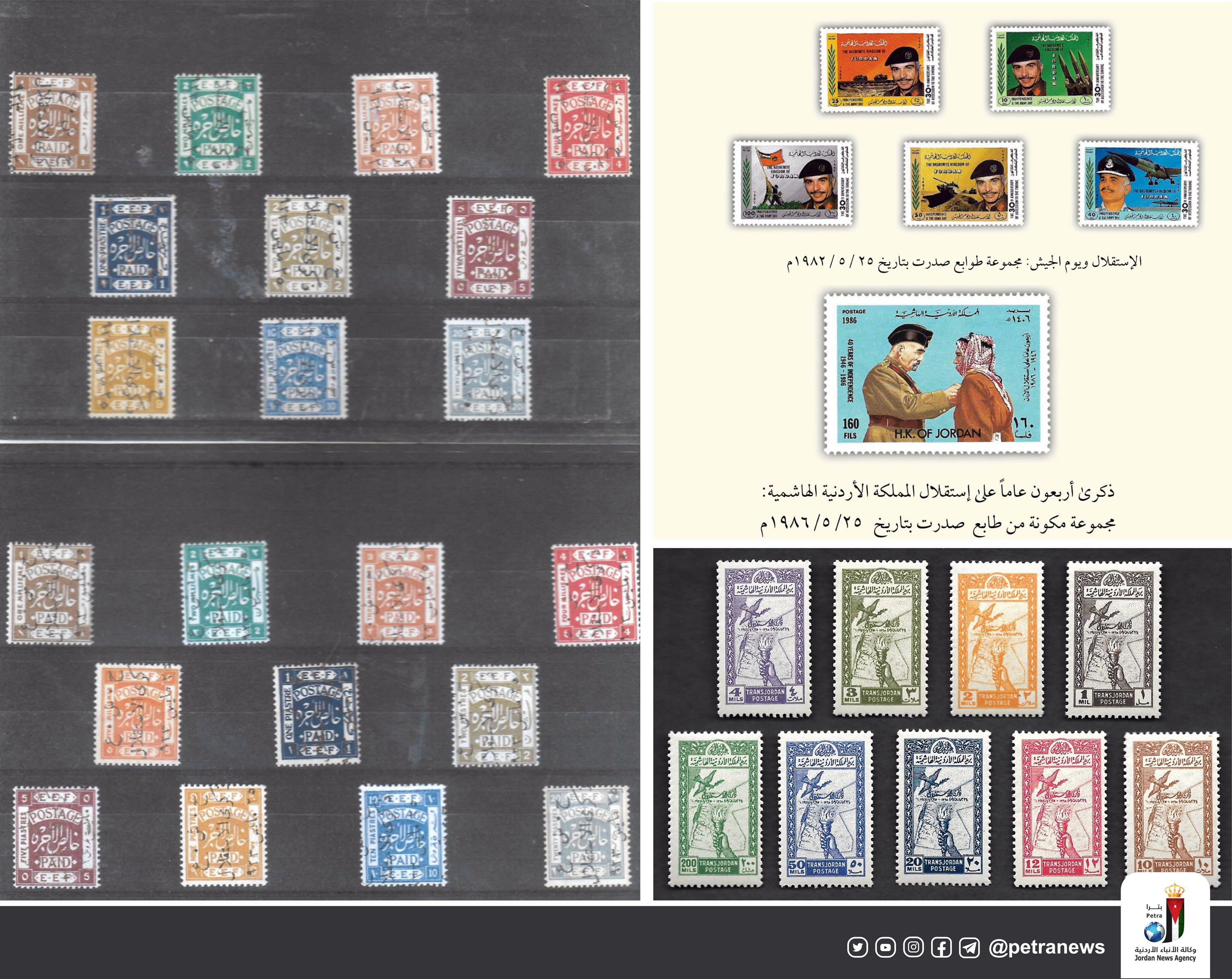 وأشار إلى صدور عدة مجموعات، كان أولها عام 1923 التي استخدمت في إمارة شرق الأردن، وعند الاستقلال التام عام 1946 صدرت مجموعة الطوابع التي تحمل صورة خارطة الأردن، وشعلة تحملها يد، وطيرا يحمل غصنا من الزيتون باسم المملكة الأردنية الهاشمية، وفي عام 1982 وعام 1984 صدرت المجموعات باسم الاستقلال ويوم الجيش، وفي عام 1986 صدرت مجموعة بعنوان أربعون عاما على استقلال الأردن (1946-1986)، وفي عام 1996 صدرت مجموعة خمسون عاماً على الاستقلال.