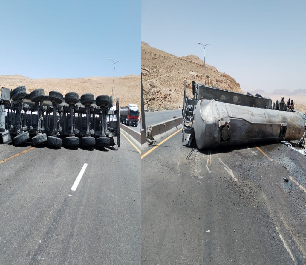 وقالت إدارة الدوريات الخارجية إن كوادرها تتعامل مع حادث تدهور لمركبة شحن (صهريج) محمل بمادة الفسفوريك منتصف نزول النقب باتجاه العقبة، نتج عنه إصابة واحدة متوسطة وتم اسعافها إلى المستشفى.