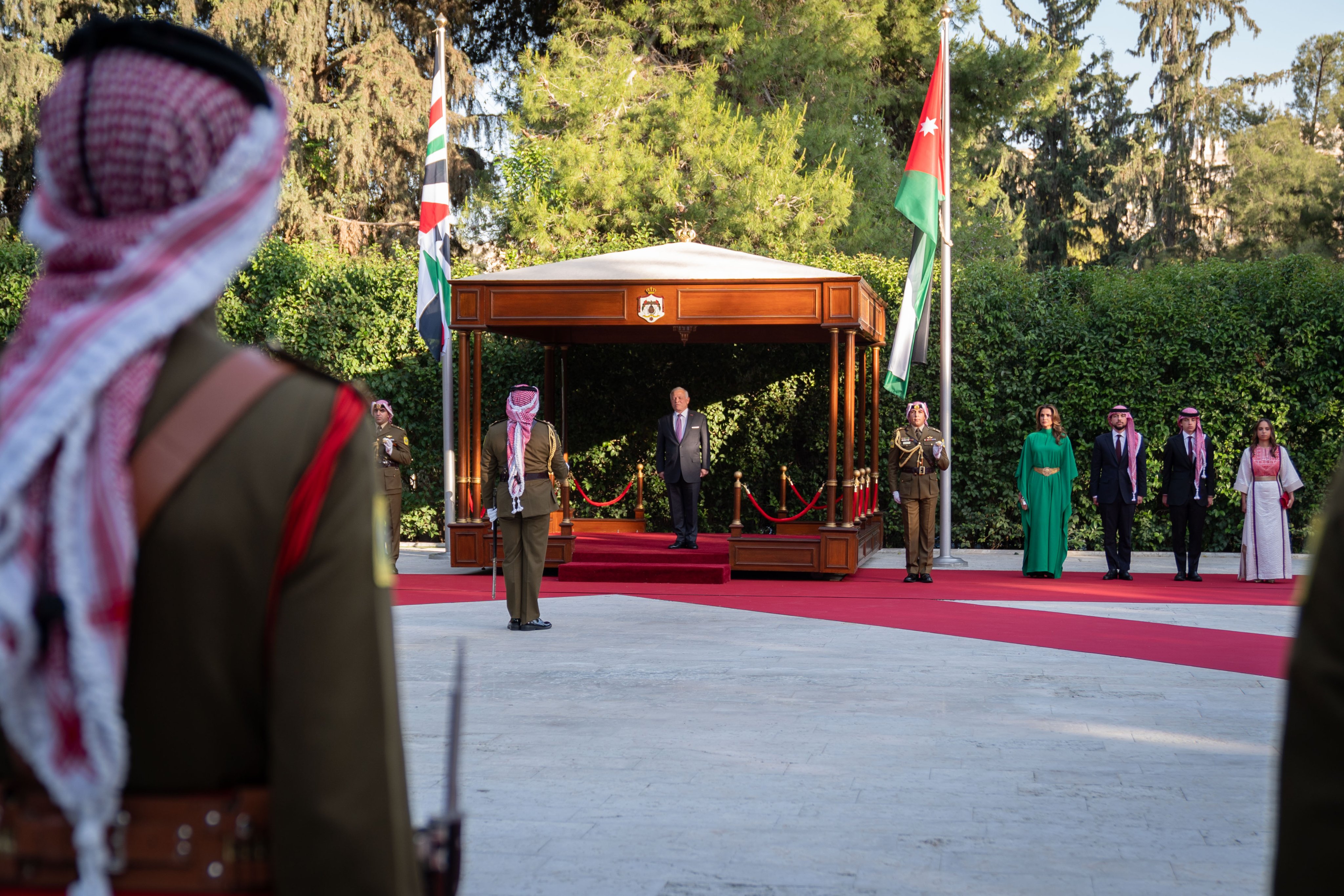 ولدى وصول جلالة الملك إلى موقع الحفل محاطا بالموكب الأحمر، أطلقت المدفعية 21 طلقة تحية لجلالته، فيما استعرض جلالته حرس الشرف الذي اصطف لتحيته، وعزفت الموسيقى السلام الملكي.