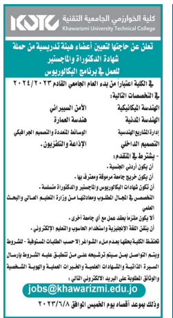 كلية الخوارزمي الجامعية التقنية بحاجة لتعيين اعضاء هيئة تدريسية