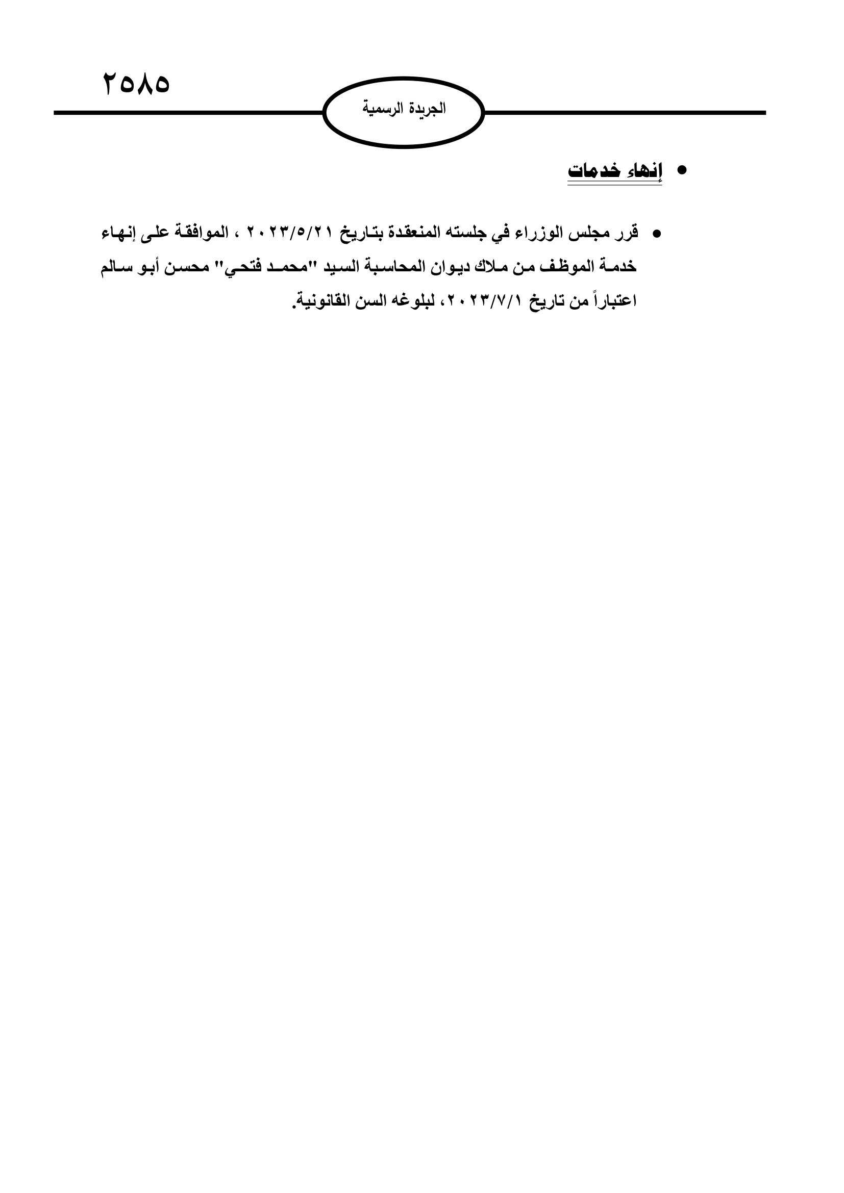 عمون - صدر في عدد الجريدة الرسمية اليوم الاربعاء قرارات مجلس الوزراء باحالة عدد من موظفي الدولة إلى التقاعد، وانهاء خدمات اخرين.