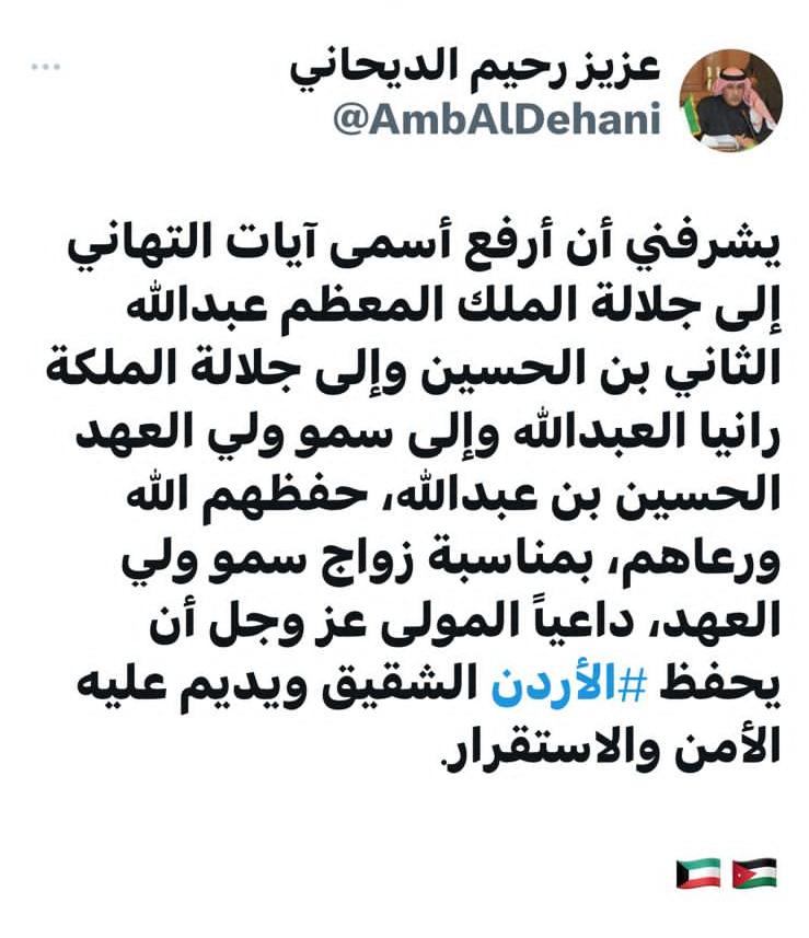عمون - هنأ مساعد وزير الخارجية الكويتي للشؤون القنصلية عزيز الديحاني، جلالة الملك عبد الله الثاني وجلالة الملكة رانيا العبدالله، بمناسبة زفاف ولي العهد سمو الأمير الحسين. |