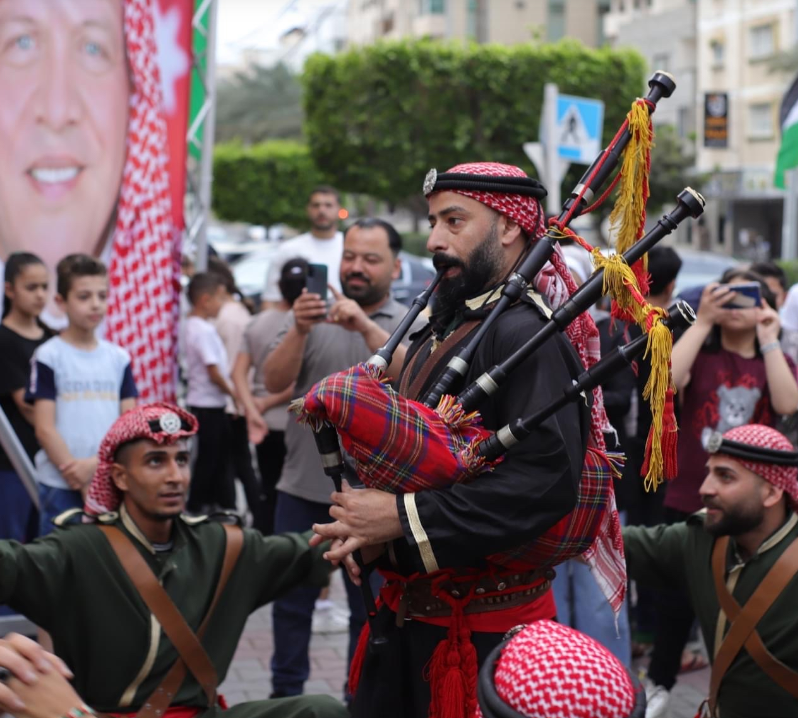 وأحتشد المواطنون الفلسطينيون قبالة أحد المولات الكبرى بمدينة غزة بينهم نساء وأطفال للمشاركة في احتفال أعد بمناسبة الزفاف الميمون، حيث شاركت فرقة دبكة في إحياء الحفل واشتمل الحفل كذلك على فقرات فنية وموسيقية .