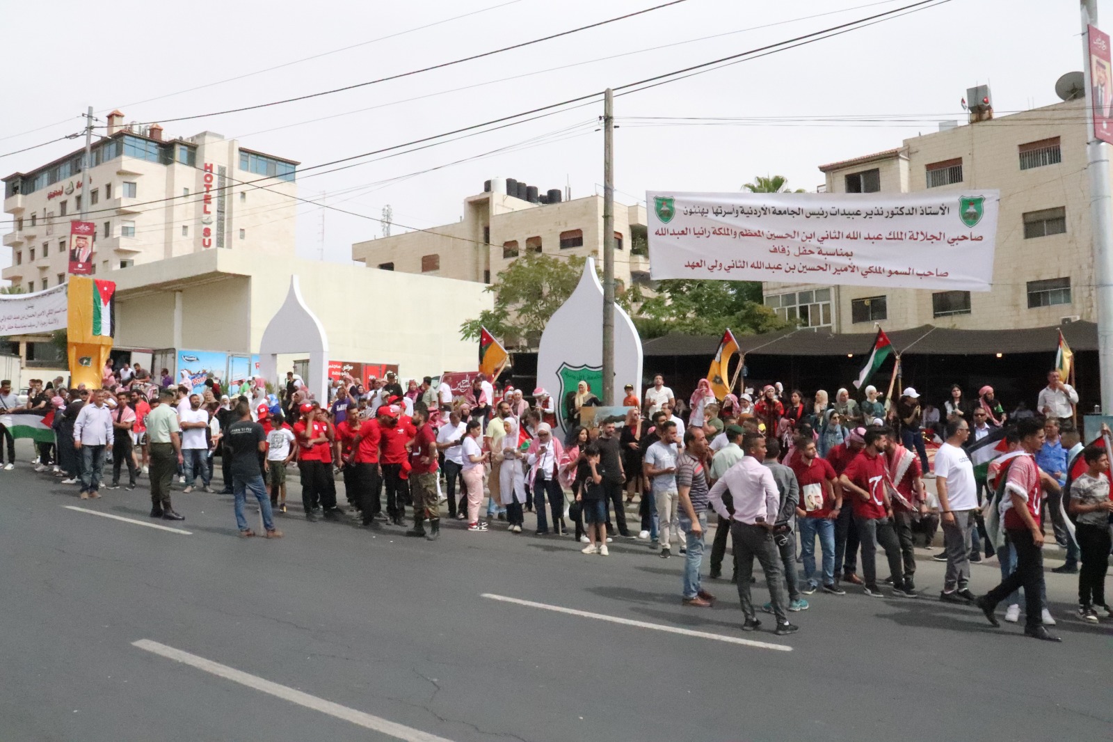 عمون - احتفاء وفرحا بالحسين، أقامت الجامعة الأردنية خيمة ضمن مسار الموكب الأحمر في منطقة الصويفية لاستقبال المهنئين.