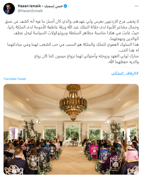 وقال اسميك، في تغريدة له عبر منصة تويتر، "لا يخفى فرح الأردنيين بعرس ولي عهدهم، والذي كان أجمل ما فيه أنه كشف عن عمق وجمال مشاعر الأبوة لدى جلالة الملك عبد الله ورقة عاطفة الأمومة لدى الملكة رانيا، حيث غابت في هكذا مناسبة مظاهر السلطة وبروتوكولات السياسة ليحل عطف الوالدين وبهجتهما".