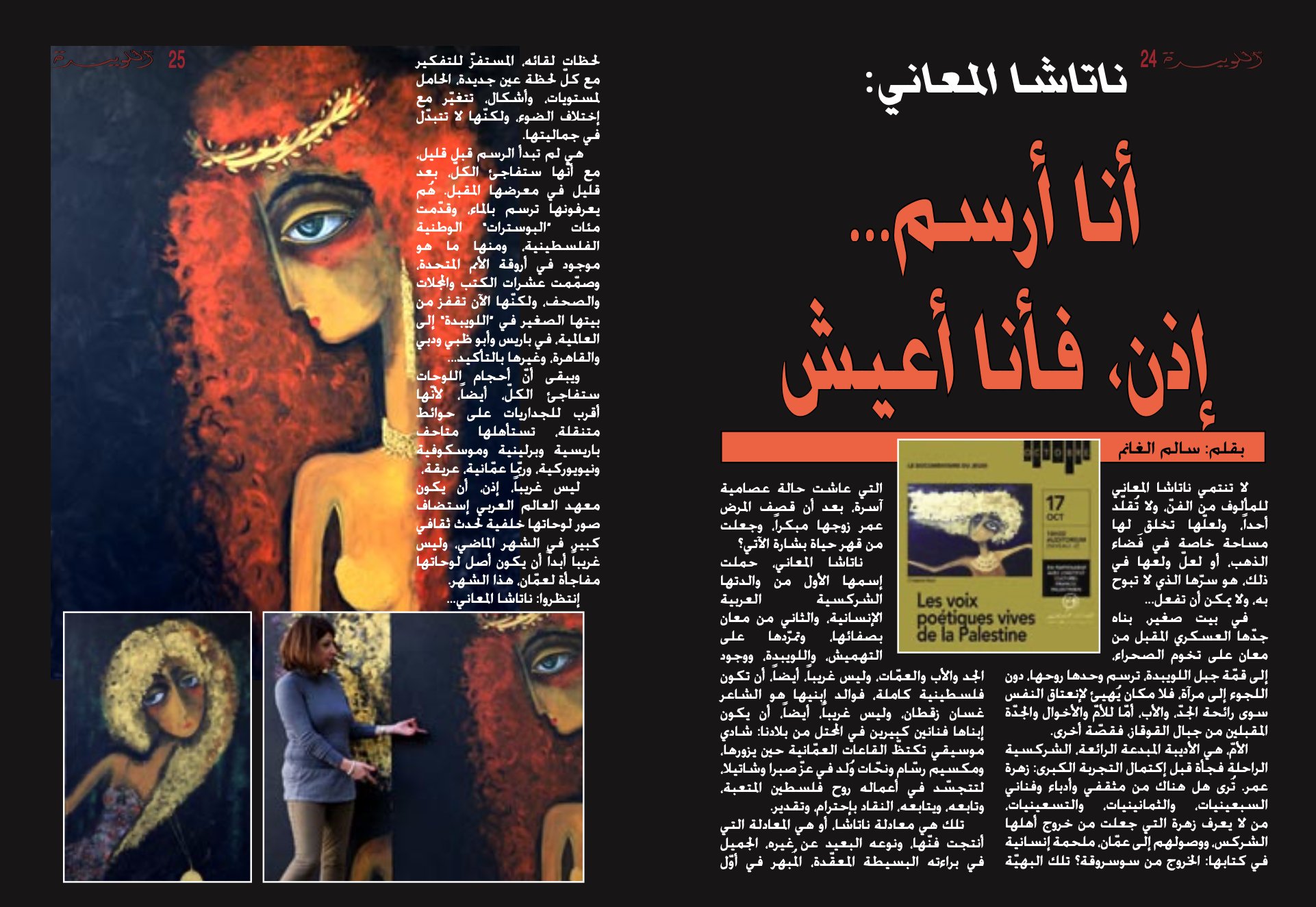 ناتاشا المعاني، حملت اسمها الأول من والدتها الشركسية العربية الإنسانية، والثاني من معان بصفائها، وتمردها على التهميش، واللويبدة، ووجود الجد والأب والعمات، وليس غريبا، أيضاً أن تكون فلسطينية كاملة، فوالد إبنيها هو الشاعر غسان زقطان، وليس غريبا، أيضا وأيضاً أن يكون إبناها فنانين كبيرين في المحتل من بلادنا: شادي موسيقي تكتظّ القاعات العمانية حين يزورها، ومكسيم رسام ونحات ُولد في عز صبرا وشاتيلا، لتتجسد في أعماله روح فلسطين المتعبة، وتابعه، ويتابعه، النقاد بإحترام، وتقدير. هي معادلة ناتاشا، أو هي المعادلة التي أنتجت فنها،ونوعه البعيد عن غيره، الجميل في براءته البسيطة المعقدة ،المبهر في أول لحظات لقائه، المستفز للتفكير مع كل لحظة عين جديدة، الحامل لمستويات، وأشكال، تتغير مع إختلاف الضوء، ولكنهالا تتبدل في جماليتها.