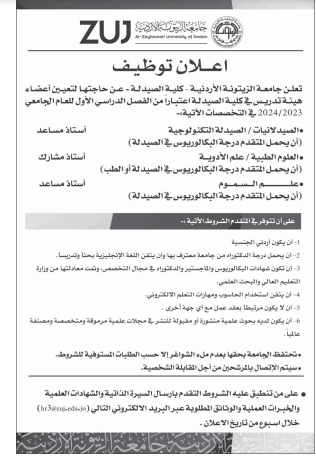 جامعة الزيتونة بحاجة لتعيين اعضاء هيئة تدريس