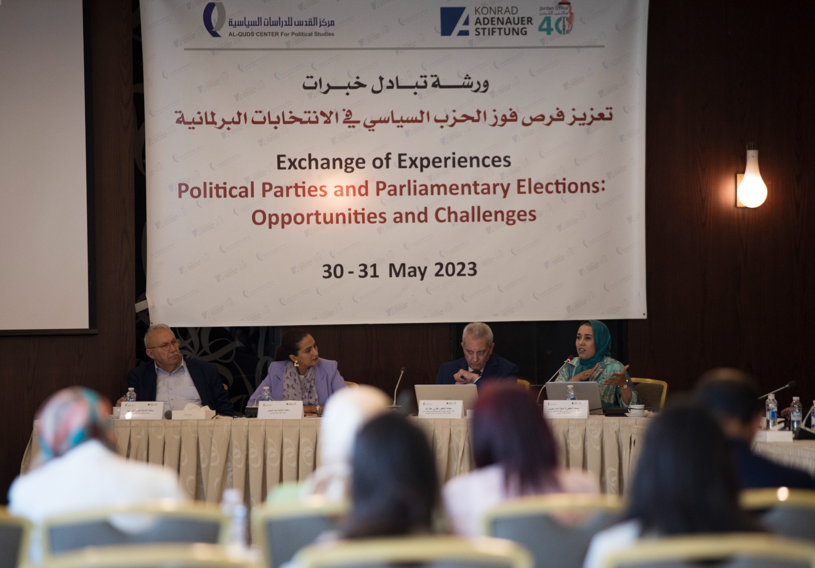 عمون - نظم مركز القدس للدراسات السياسية ومؤسسة كونراد أديناور وبالتعاون مع الهيئة المستقلة للانتخابات، نهاية الأسبوع الفائت، ورشة "تبادل خبرات" بعنوان "تعزيز فرص الأحزاب السياسية في الانتخابات العامة"، شارك فيها قرابة 70 مشاركاً ومشاركة من الأمناء العامين وقادة الصف الأول في أكثر من عشرين حزباً مسجلاً بموجب قانون الأحزاب السياسية الجديد وخبراء من المغرب ولبنان.