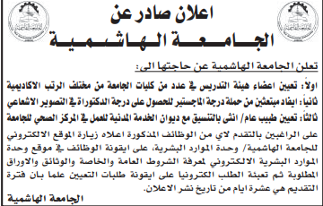 الجامعة الهاشمية بحاجة لتعيين اعضاء هيئة تدريسية