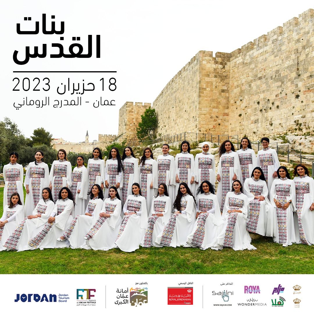 عمون - بتنظيم من جمعية أصدقاء مهرجانات الأردن، تعود فرقة بنات القدس للعاصمة عمان مساء الأحد الموافق 18 من الشهر الجاري لتقدم عرض على مسرح المدرج الروماني بقلب العاصمة عمان، من ضمن موسم موسيقي وفني غني في المملكة لصيف ٢٠٢٣ .