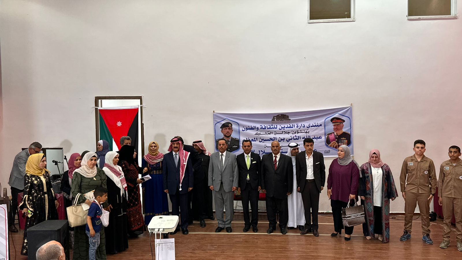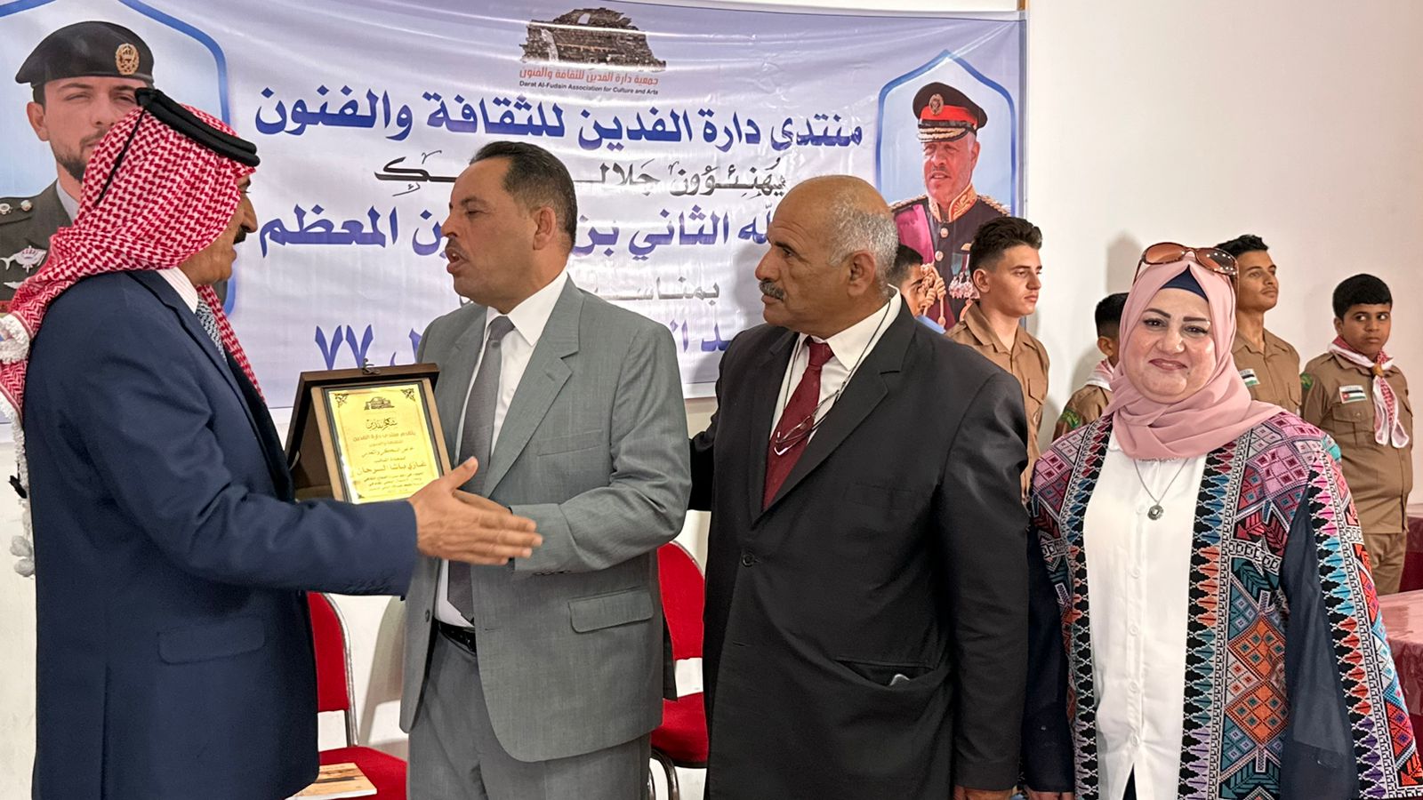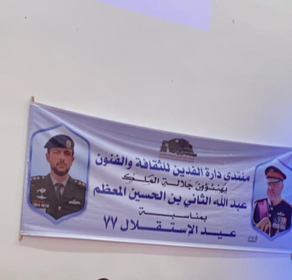 وألقى الرئيسُ الفخريُّ لمنتدى دارةِ الفدين للثقافةِ والفنون الدكتور خلف الحمّاد كلمة أكد فيها إنه لمن بواعثِ اعتزازي وسروري أن نحتفلَ اليومَ في منتدى دارةِ الفدين للثقافةِ والفنون بالعيد السابعِ والسبعينَ لاستقلالِ المملكةِ الأردنيةِ الهاشمية التي نتفيأ ظلالَها وننعُم بأمنِها وأمانِها، مستذكرينَ مظاهرَ البهجةِ والسرورِ التي عمّتِ المملكةَ بعفويةٍ وتلقائية احتفالاً بهذه المناسبةِ العزيزة، وكذلك بالعرسِ الملكيِّ لأميرنا المحبوبِ صاحبِ السموِّ الملكيِّ الحسينِ بن عبدِالله الثاني المعظم، والذي أكدَ حجمَ الحبِّ والولاءِ الكبيرَين للهاشميينَ بقيادةِ مليكِنا المفدّى جلالةِ الملكِ عبدِالله الثاني ابن الحسين، فقد جدّد الأردنيونُ البيعةَ للهاشميينَ خلالَ الأيامِ الماضيةِ في احتفالاتِ الاستقلالِ وزفافِ وليِّ عهدِنا المحبوبِ عريسِ الوطنِ بوضوحٍ شديدٍ وعناوينَ بارزة.