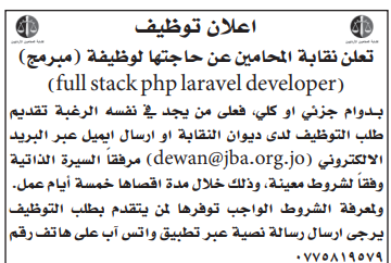 مطلوب مبرمج للعمل لدى نقابة المحامين