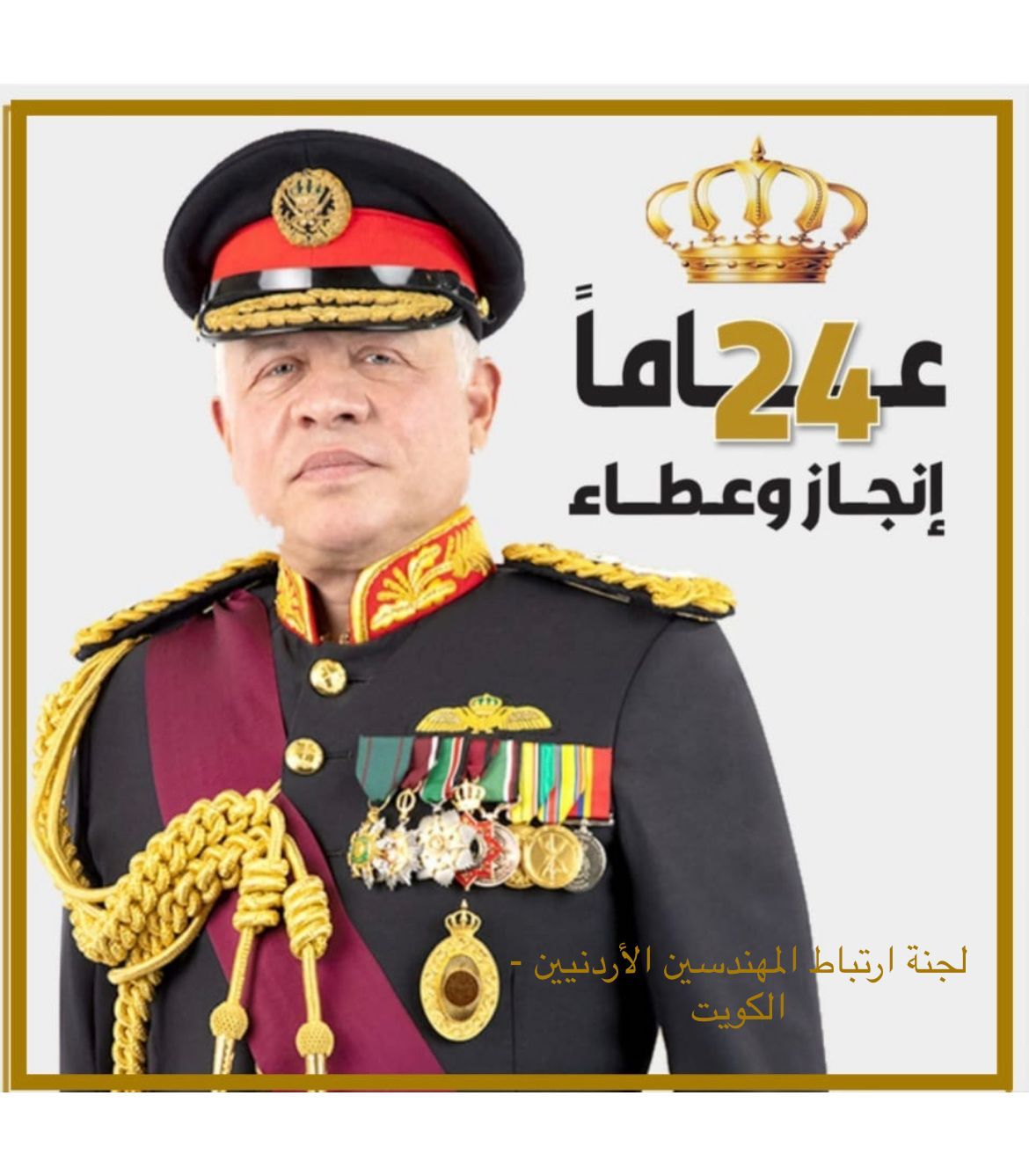 عمون - تتقدم لجنة ارتباط المهندسين الاردنيين في دولة الكويت، ممثله برئيسها م . عمر علي الحمود ونائب الرئيس واعضاء ونيابة عن المهندسين الاردنيين في دولة الكويت، من مقام حضرة صاحب الجلالة الهاشمية الملك عبدالله الثاني ابن الحسين المعظم وولي عهده الأمين سمو الأمير الحسين بن عبدالله الثاني، بخالص التهنئة والتبريك بمناسبة عيد الجلوس الملكي الرابع والعشرين، وذكرى الثورة العربية الكبرى، ويوم الجيش. |