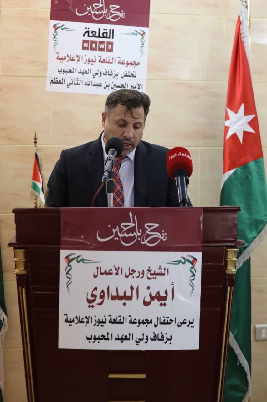 عمون - تحت رعاية سعادة الشيخ الدكتور أيمن البداوي أقامت مجموعة القلعة نيوز الإعلامية احتفالا خاصًا ومميزا بمناسبة الأعياد الوطنية، الإستقلال وعيد الجيش والثورة العربية والجلوس الملكي، وزفاف سمو ولي العهد الأمير الحسين بن عبدالله الثاني .