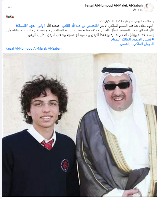 عمون - هنأ المستشار في الديوان الأميري لدولة الكويت الشيخ فيصل الحمود المالك الصباح، سمو ولي العهد الأمير الحسين بن عبدالله الثاني بمناسبة عيد ميلاده الميمون. |
