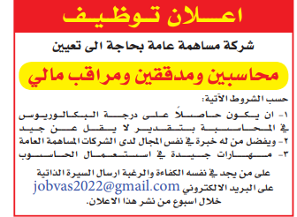 مطلوب محاسبين ومدققين ومراقب مالي