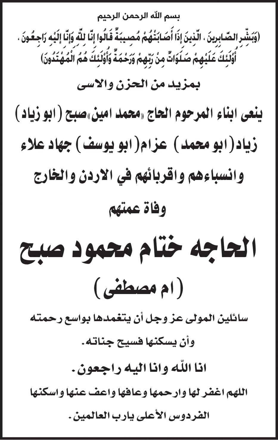 عمون - بسم الله الرحمن الرحيم، (وَبَشِّرِ الصَّابِرِينَ الَّذِينَ إِذَا أَصَابَتْهُمْ مُصِيبَةٌ قَالُوا إِنَّا لِلَّهِ وَإِنَّا إِلَيْهِ رَاجِعُونَ أُوْلَئِكَ عَلَيْهِمْ صَلَوَاتٌ مِنْ رَبِّهِمْ وَرَحْمَةٌ وَأُوْلَئِكَ هُمُ الْمُهْتَدُونَ)، صدق الله العظيم. |