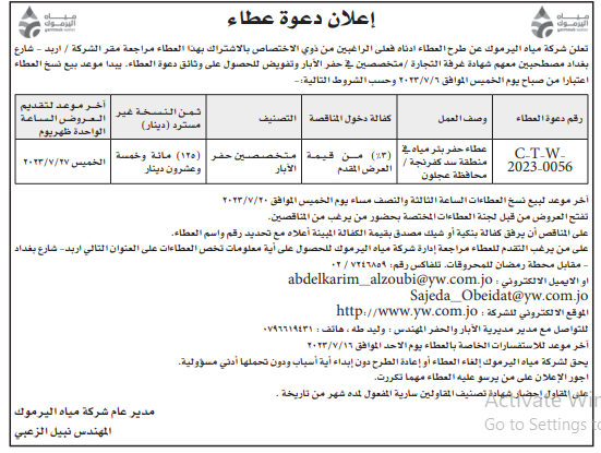 عطاء صادر عن شركة مياه اليرموك