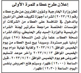 مطلوب شراء اجهزة تكييف لوزارة الخارجية وشؤون المغتربين