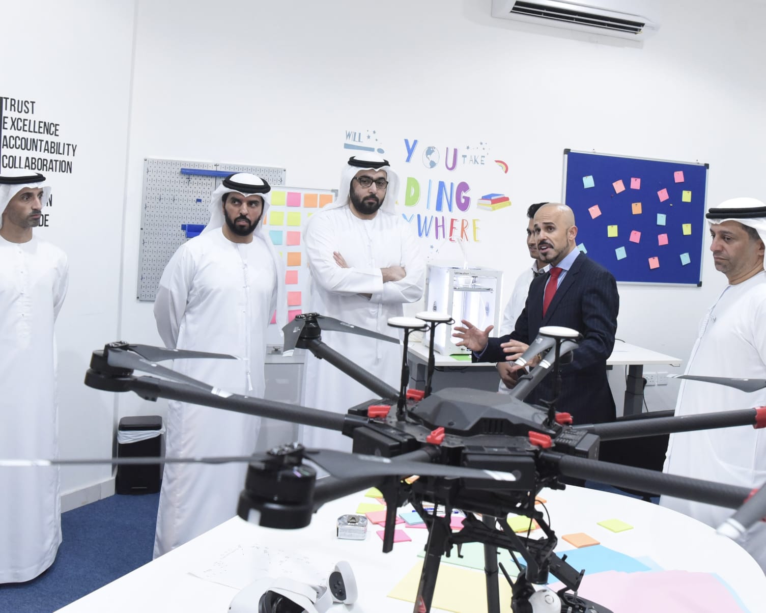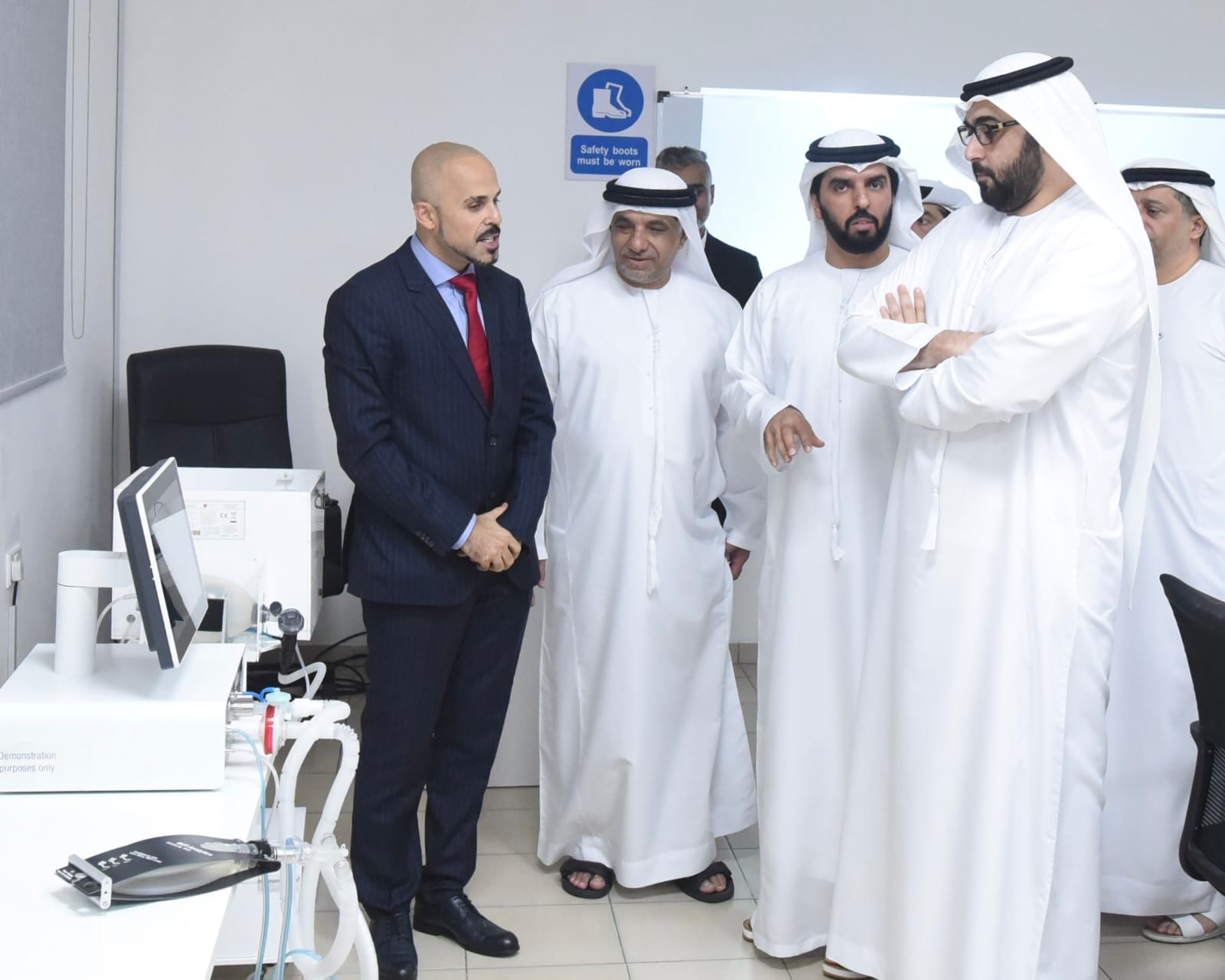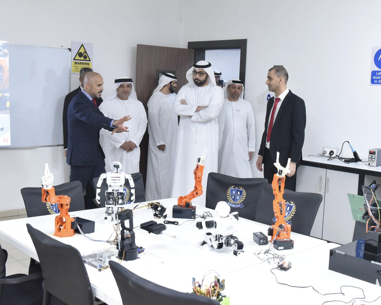 واطلع على الحرم الجامعي الجديد، واستمع إلى شرح مفصل من خليفة البلوشي رئيس مجلس إدارة الكلية البريطانية التطبيقية عن المختبرات المتقدمة ومركز الابتكار المطور، وأقسام التقنيات والتصنيع، فضلاً عن أقسام الواقع الافتراضي والمعزز والأقسام التكنولوجية الأخرى التي تشكل قاعدة مؤثرة لنماذج تعليمية متطورة للطلبة تركز على التعليم التطبيقي والعملي والتجريبي.