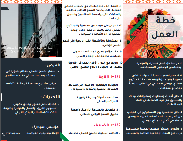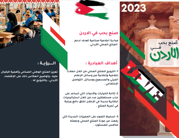 هذه المبادرة الإعلاميّة الصّناعيّة الهادفة لدعم المنتج المحليّ الأردنيّ ، وذلك بالتّرويج للمبادرة من خلال الحملات الإعلاميّة المرئيّة والمسموعة ووسائل التّواصل الإجتماعيّ ، وطرح الخيارات المتاحة لجذب المستهلكين الجّدد ، وإستخدام إستراتيجيّات إبتكاريّة جديدة لبناء دافع التجربة ، ومن نقاط قوة المبادرة ربط الصّناعة الوطنيّة بالثّقافة والسّياحة ، ويأتي ذلك للتصدّي للنظرة السّلبية للمنتج المحليّ الأردني.