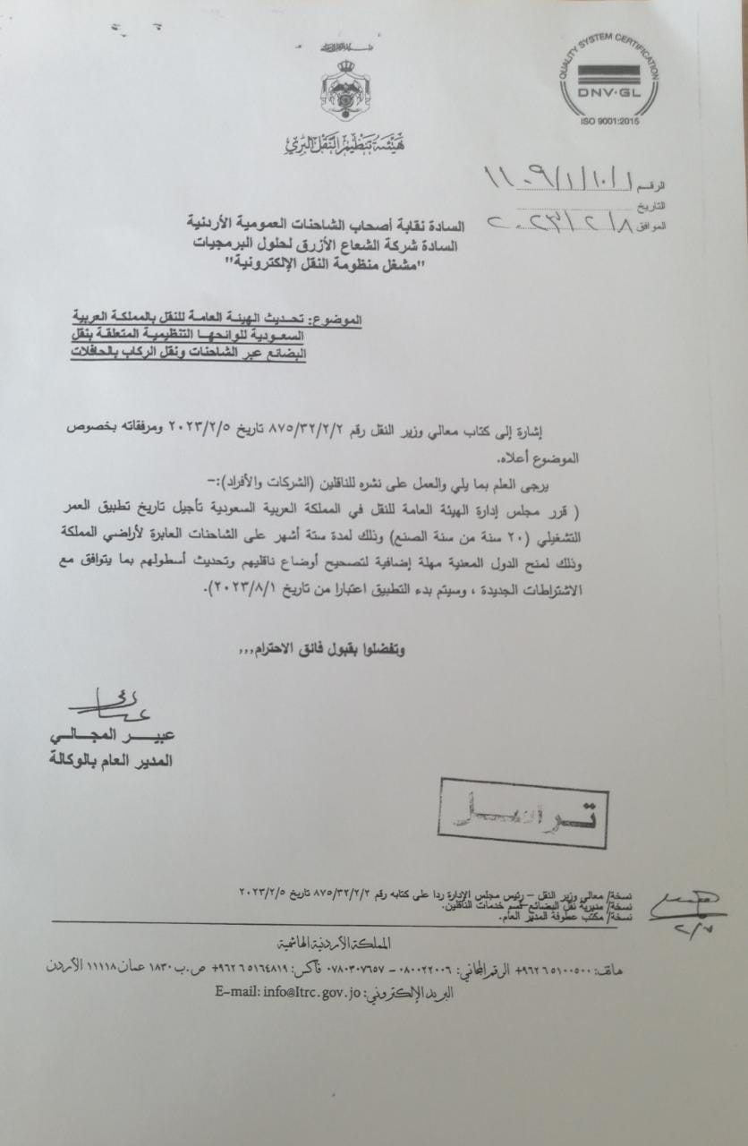 وقال الوريكات، إن هذا القرار صدر سابقا من قبل هيئة النقل السعودية، وتم تأجيل تطبيقه وأصبح ساري المفعول اعتبارا من الأول من آب 2023.