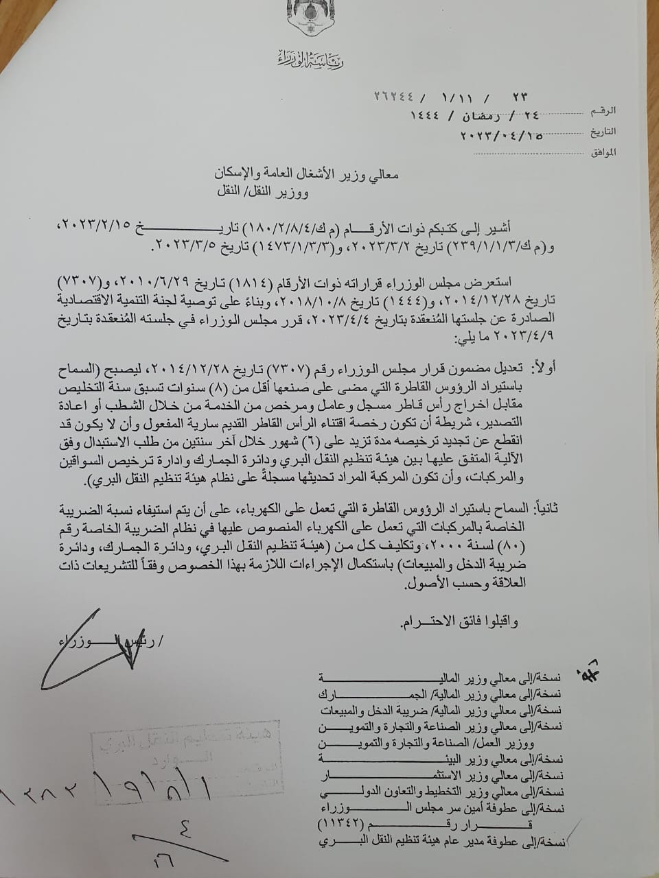 وبين الوريكات أن الحكومة الأردنية اتخذت إجراءات عدة سابقاً، منها قرار مجلس الوزراء الصادر في منتصف شهر نيسان الماضي بناء على توصية مجلس إدارة الهيئة والهادف إلى رفع عمر رأس القاطر بالتسجيل لأول مرة والتي مضى على صنعها أقل من 8 سنوات بدلاً من 5 سنوات، وهو العمر التشغيلي الذي كان معمولا به سابقا، وذلك لإعطاء فرصة للناقلين العاملين على أنماط نقل الشحن كافة لتحديث أسطولهم لغايات رفع مستوى السلامة على الطرق وتمكينهم من العمل على النقل الخارجي مع دول الجوار ضمن العمر التشغيلي المسموح به، وتماشيا مع الاتفاقيات المعتمدة من جامعة الدول العربية.