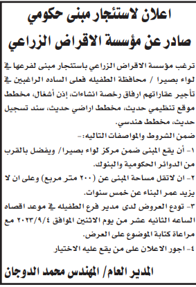 مطلوب استئجار مبنى حكومي لمؤسسة الاقراض الزراعي/الطفيلة