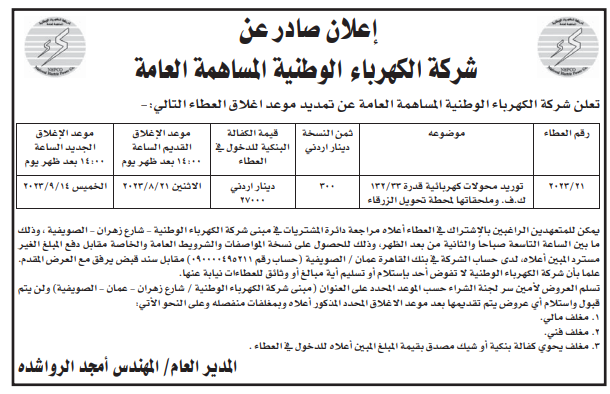 عطاءات صادرة عن شركة الكهرباء الوطنية