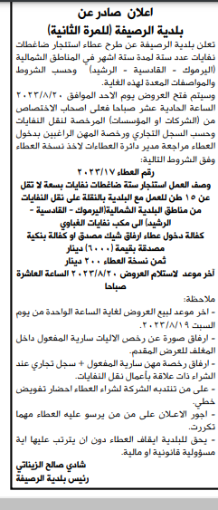 مطلوب استئجار ضاغطات نفايات لبلدية الرصيفة