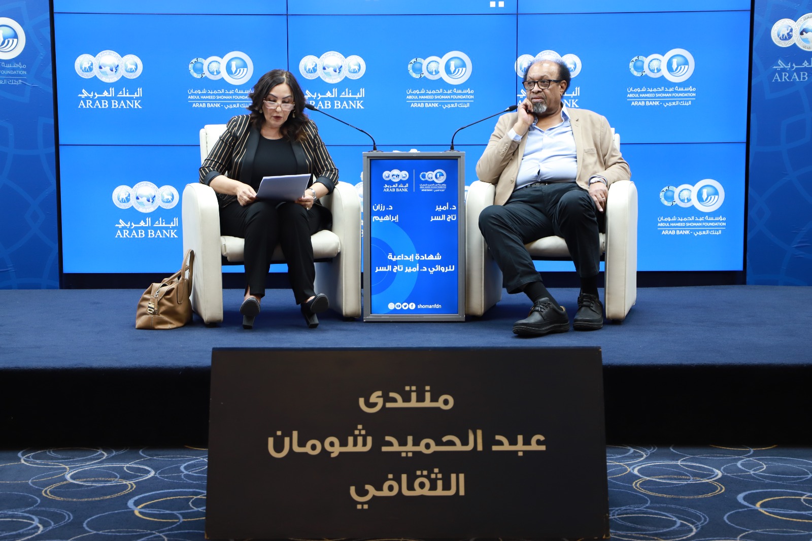 عمون - استضاف منتدى مؤسسة عبد الحميد شومان الثقافي، ذراع البنك العربي للمسؤولية الثقافية والاجتماعية، مساء أمس الاثنين، الروائي السوداني أمير تاج السر، للحديث عن تجربته الإبداعية، وتحولاته الكتابية، قدمته فيها وأدارت الحوار مع الجمهور الناقدة الدكتورة رزان إبراهيم، بحضور السفير السوداني في عمان حسن سوار الدهب والعديد من المثقفين والأدباء والمعنيين.