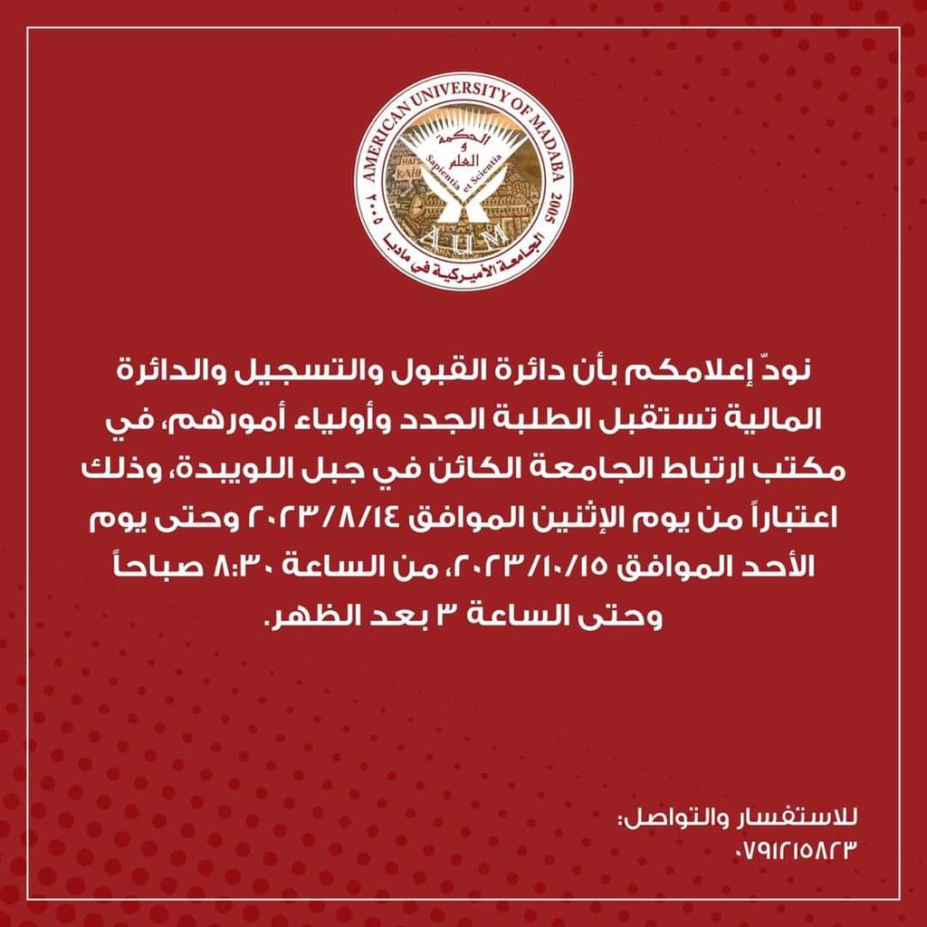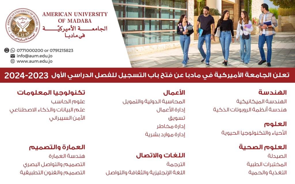 ولمعرفة المزيد عن الجامعة الأميركية في مادبا، يرجى زيارة الرابط التالي: https://aum.edu.jo/.