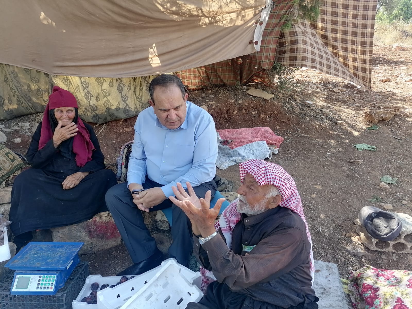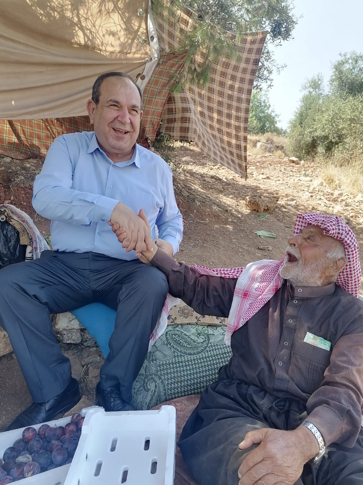 اذا كنت عائدا من الشمال على الطريق السريع الواصل بين الرمثا وعمان وقبل ان تصل ثغرة عصفور بقليل وبعد معصرة الزيتون بمئات الامتار انظر إلى يمين الشارع ستجد تحت شجرة لزاب عملاقة رجل ثمانيني وجهه من ملامح الارض وصوته مشبع بالحب للحياة وللناس تجلس الى يمينه سيدة وقورة مثل امهاتنا.