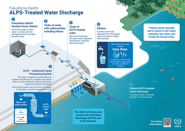 الوكالة الدولية للطاقة الذرية وحسب تصريح رئيسها رافائيل ماريانو والتي اصدرت تقريرا مفصلا رائعا يحتوي 140 صحفة مستعرضا كافة التقنيات التي اتبعتها اليابان في معالجة المياه وحسب ما يطلق عليه نظام معالجة السوئل المتقدم "ALPS" إن الخطة تتوافق مع الممارسات العاليمة وان تعاوننا ووجودنا سيعزز في بناء الثقة في اليابان وخارجها بأن التخلص من المياه يتم دون أي آثار سلبية وتأثيرها على صحة الإنسان والبيئة" .