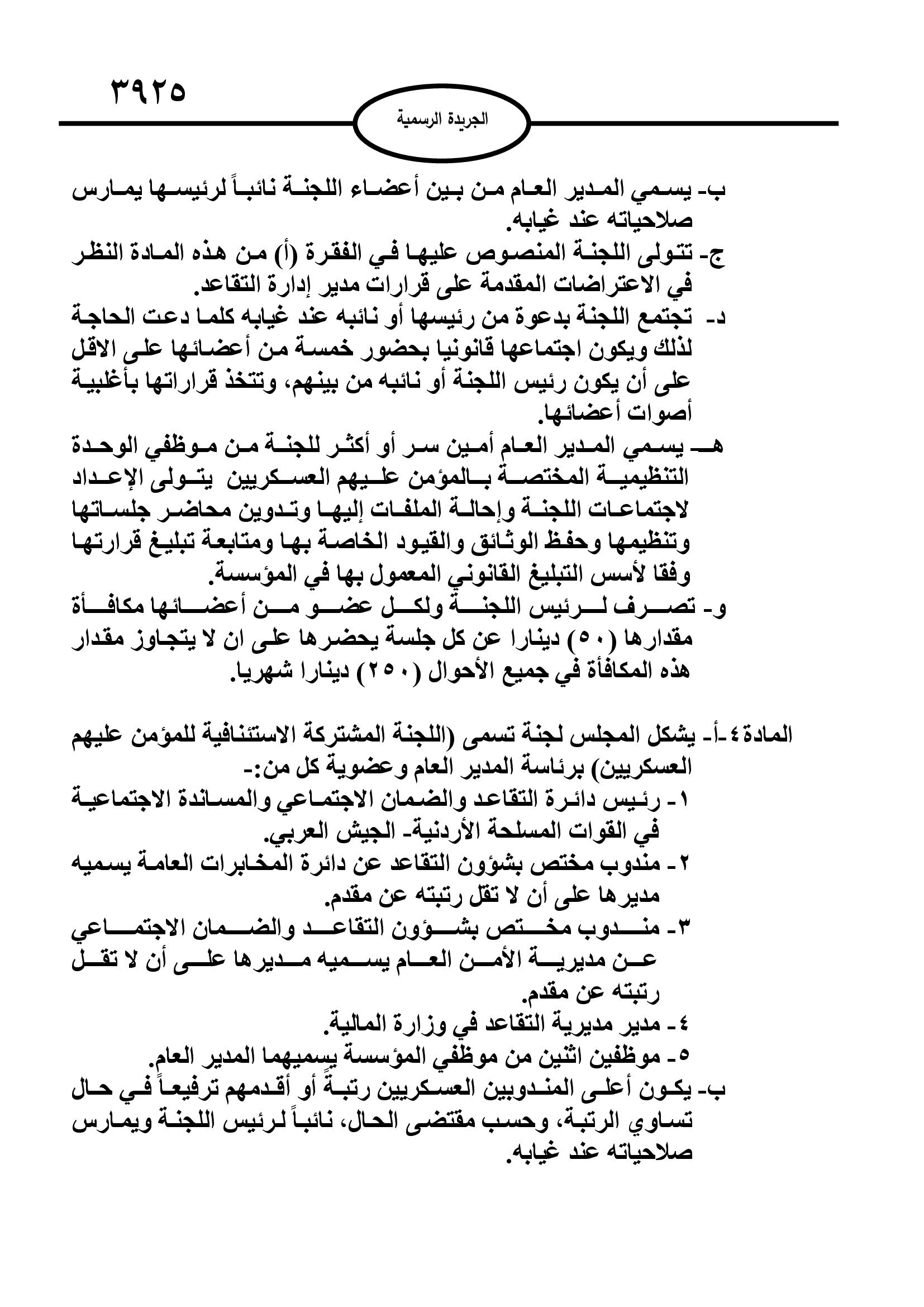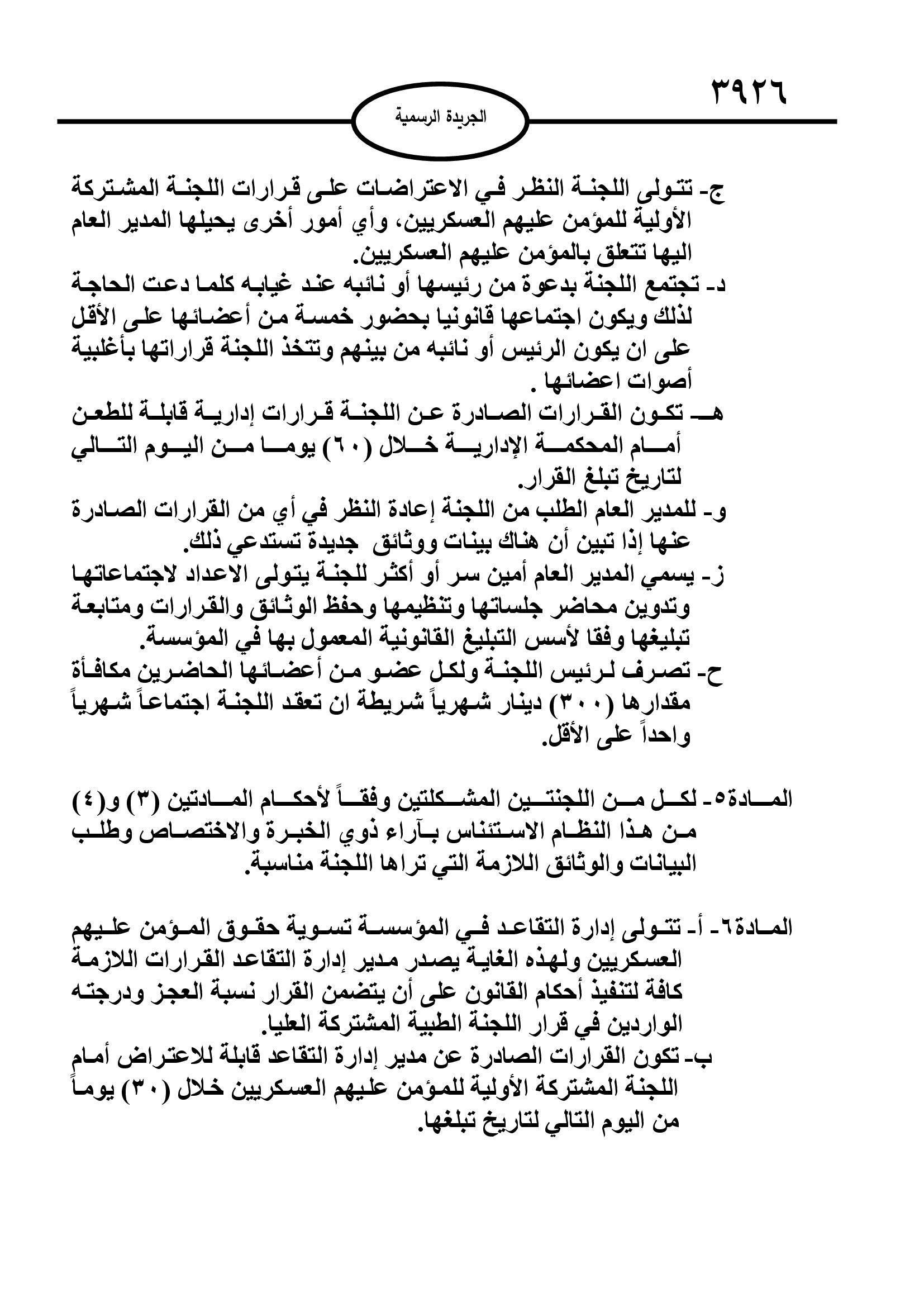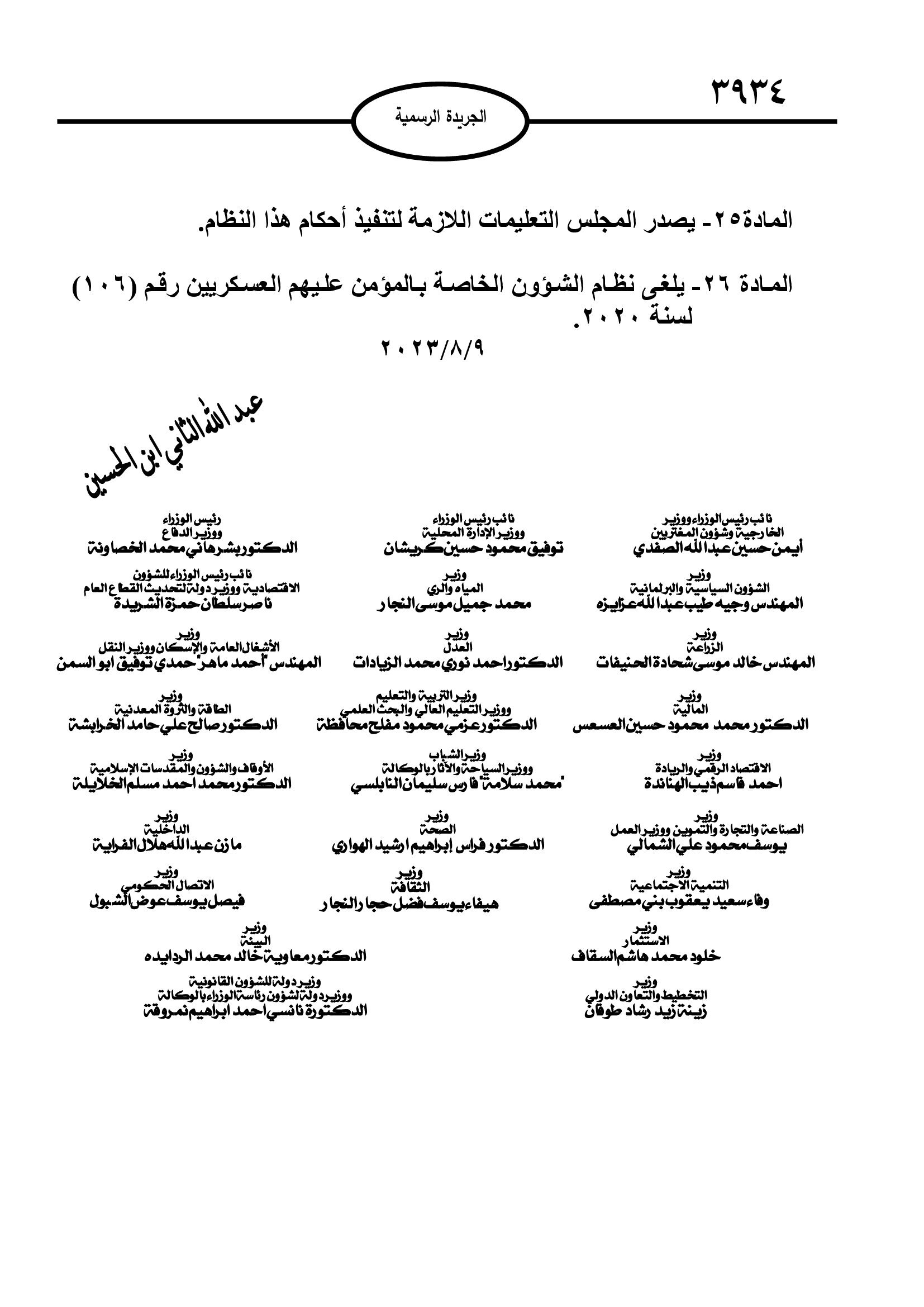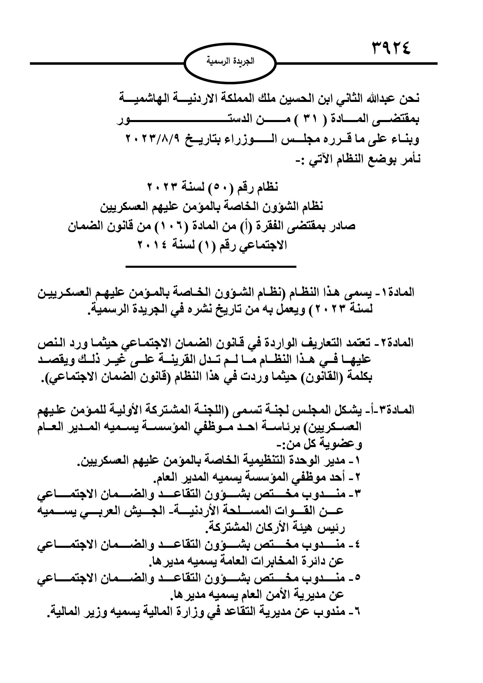 عمون - صدر في عدد الجريدة الرسمية اليوم الخميس، نظام الشؤون الخاصة بالمؤمن عليهم العسكريين.
