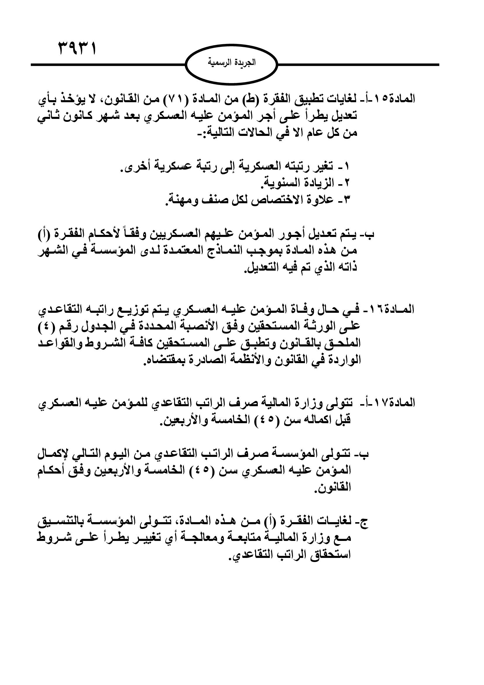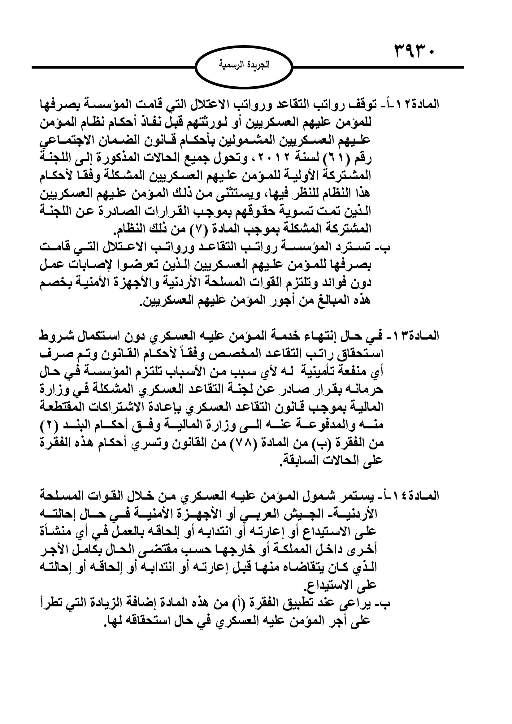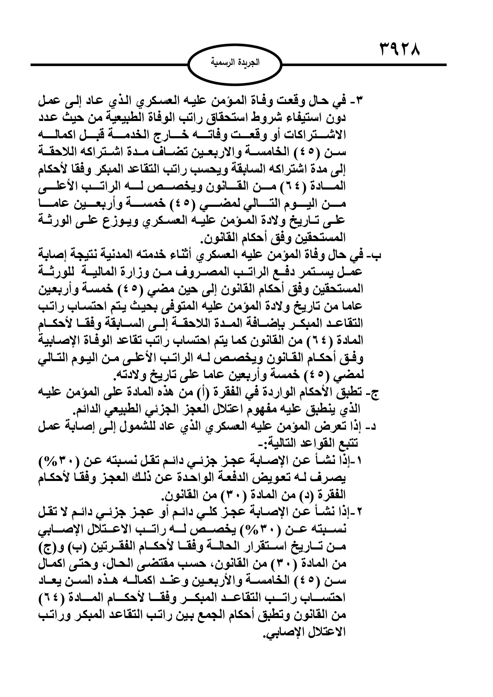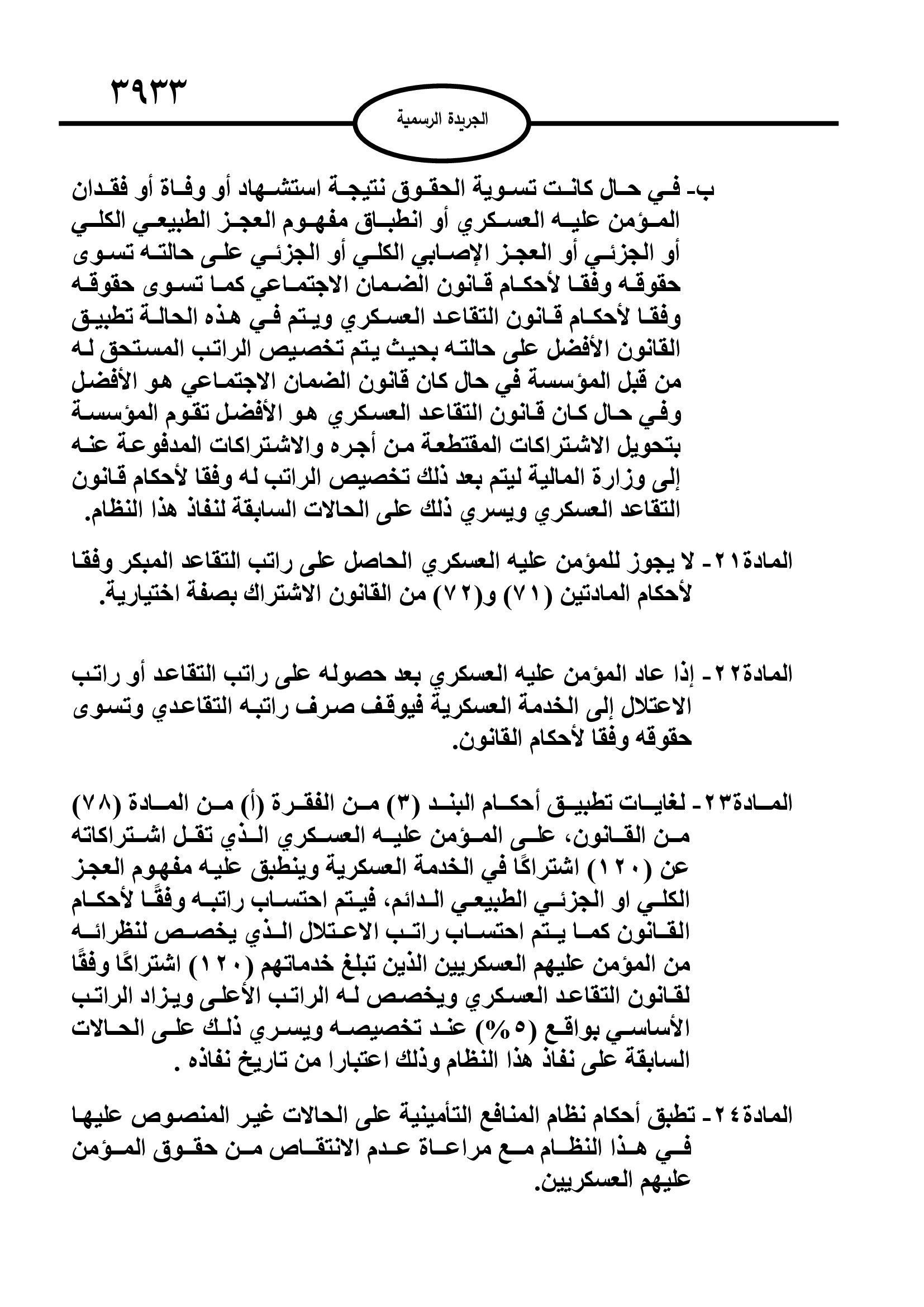 -في حال كانت تسوية الحقوق نتيجة استشهاد أو وفاة أو فقدان المؤمن عليه العسكري أو انطباق مفهوم العجز الطبيعي الكلي أو الجزئي أو العجز الإصابي الكلي أو الجزئي على حالته تسوى حقوقه وفقًا لأحكام قانون الضمان الاجتماعي كما تسوى حقوقه وفقًا لأحكام قانون التقاعد العسكري، ويتم في هذه الحالة تطبيق القانون الأفضل على حالته بحيث يتم تخصيص الراتب المستحق له من قبل الضمان في حال كان قانون الضمان الاجتماعي هو الأفضل، وفي حال كان قانون التقاعد العسكري هو الأفضل تقوم الضمان بتحويل الاشتراكات المقتطعة من أجره والاشتراكات المدفوعة عنه إلى وزارة المالية ليتم بعد ذلك تخصيص الراتب له وفقًا لأحكام قانون التقاعد العسكري ويسري ذلك على الحالات السابقة لنفاذ هذا النظام.