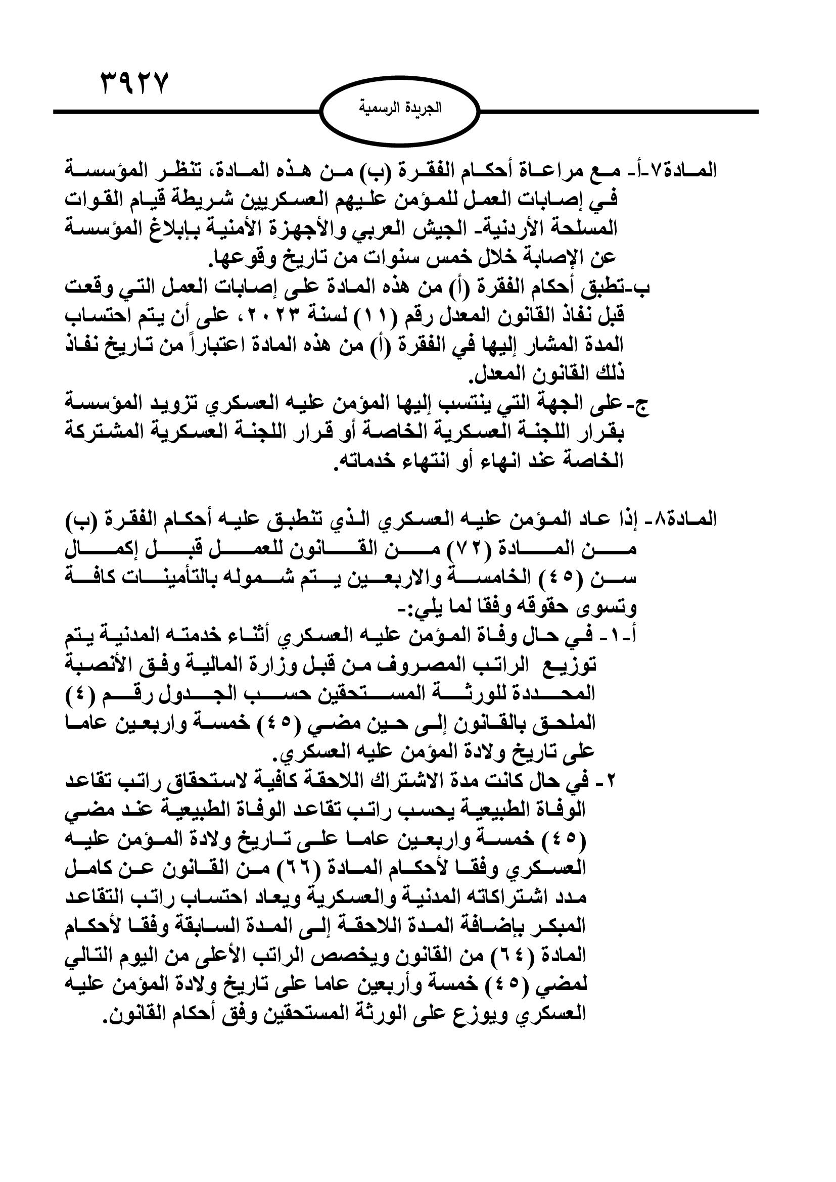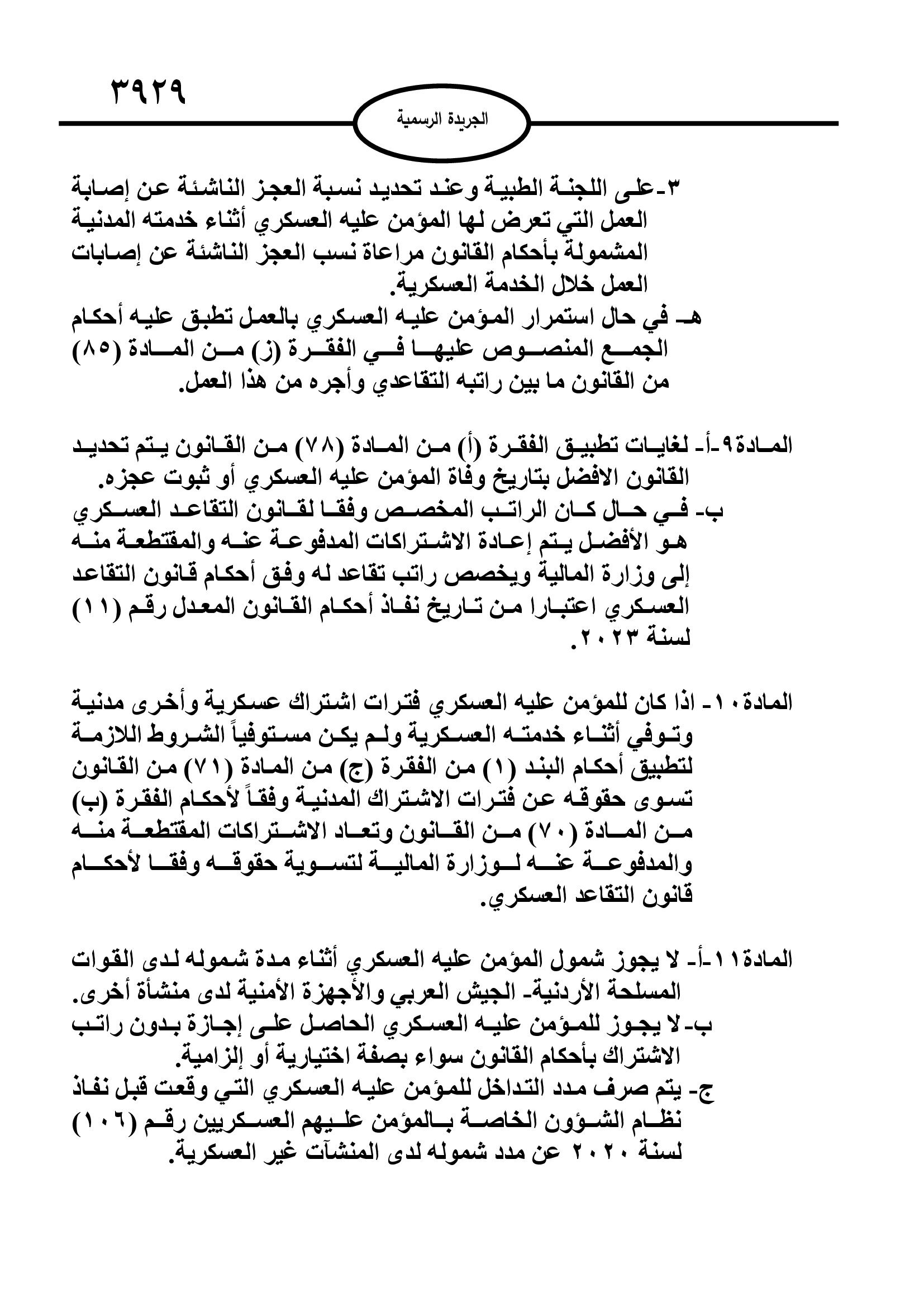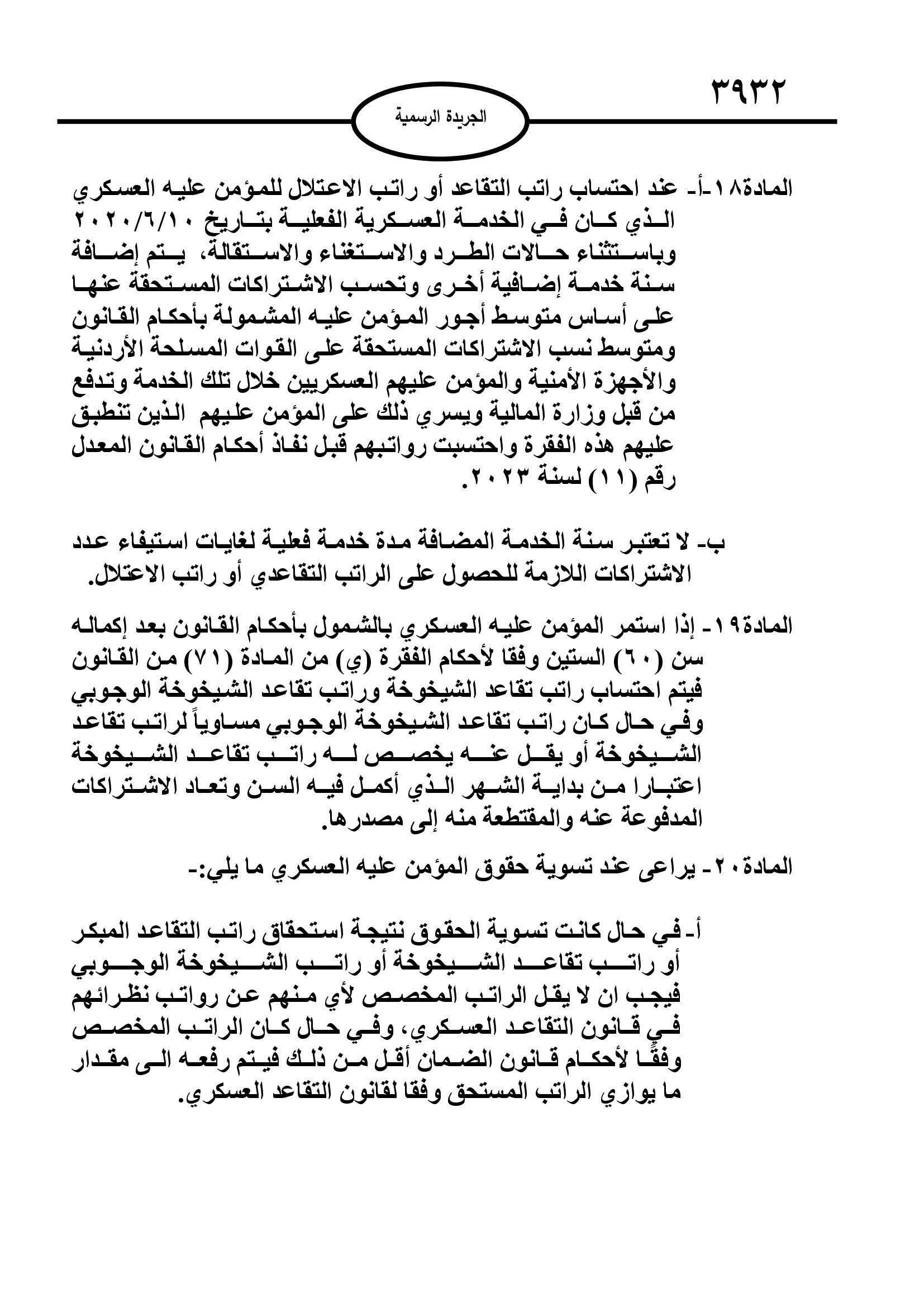 وعند احتساب راتب التقاعد أو راتب الاعتلال للمؤمن عليه العسكري الذي كان في الخدمة العسكرية الفعلية بتاريخ 10 حزيران 2020 وباستثناء حالات الطرد والاستغناء والاستقالة، يتم إضافة سنة خدمة إضافية أخرى وتحسب الاشتراكات المستحقة عنها على أساس متوسط أجور المؤمن عليه المشمولة بأحكام القانون ومتوسط نسب الاشتراكات المستحقة على القوات المسلحة الأردنية والأجهزة الأمنية والمؤمن عليهم العسكريين خلال تلك الخدمة وتدفع من قبل وزارة المالية ويسري ذلك على المؤمن عليهم الذين تنطبق عليهم هذه الفقرة واحتسبت رواتبهم قبل نفاذ أحكام القانون المعدل رقم 11 لسنة 2020، وفقًا للنظام.
