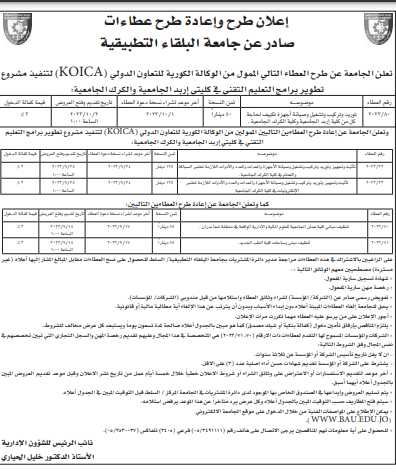 عطاءات صادرة عن جامعة البلقاء التطبيقية