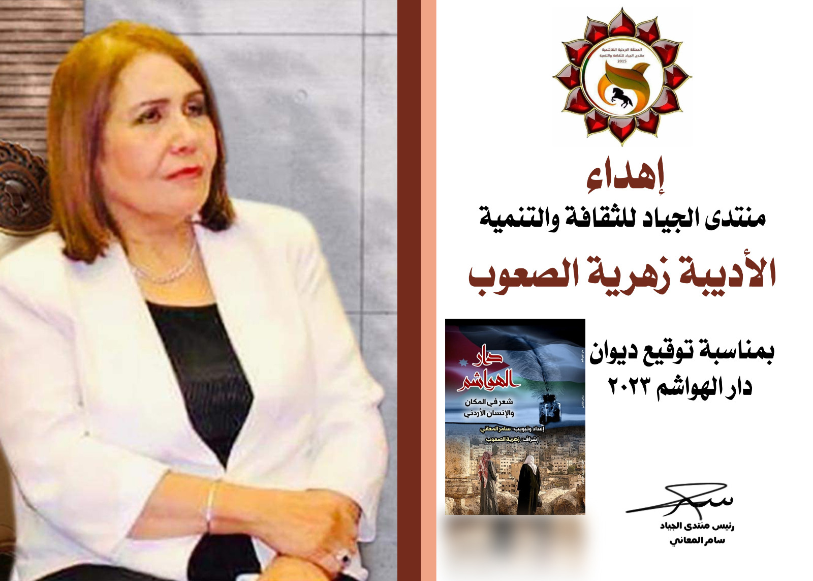عمون - أقيم أمس الخميس بالتعاون بين منتدى الجياد للثقافة والتنمية ومنتدى البيت العربي تحت رعاية الأديبة زهرية الصعوب رئيس دارة المشرق للفكر والثقافة في مقر البيت العربي في العاصمة الأردنية عمان حفل اشهار ديوان (دار الهواشم في المكان والإنسان الأردني).