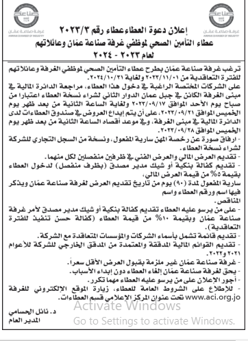 مطلوب توفير عروض تأمين صحي لموظفو غرفة صناعة عمان