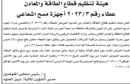 مطلوب شراء اجهزة مسح اشعاعي لهيئة تنظيم قطاع الطاقة و المعادن